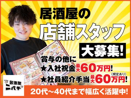 職種/仕事内容 | 仕事内容 未経験から店長へ。エリア外転勤なし!年数回の昇格・昇給も可能! 未経験からスタートしたスタッフ多数活躍中! 基礎から学べる教育体制と、 頼れる先輩のサポートで安心して成長できます。 ー・ー・ー・ー・ー・ー・ー < このお仕事のミリョクPoint!> ●入社1年目から平均月収35.8万円も可能! ●入社祝金最大60万円!/規定あり ●社員紹介手当最大60万円!/規定あり ●食事補助あり!(1勤務に1食無料) ●動画マニュアル完備!安心の教育体制! ●髪型・髪色自由!※規定あり ●前給制度あり※規定あり ●社員割引(会計から20%オフ) ●カンリー福利厚生導入中! (映画・ネイル・コンビニなど数百種類の割引が利用し放題) ー・ー・ー・ー・ー・ー・ー <お仕事内容> ジャンボ焼鳥と釜めしが旨い店! 低価格居酒屋「ニパチ」で店舗スタッフのお仕事! ●接客や料理の配膳などのサービス業務 ●一品料理の調理や仕込み ●シフト作成・売上管理などをお任せ! ー・ー・ー・ー・ー・ー・ー <自己申請昇格制度あり> 年数回の昇格・昇給も可能! 2年目で店長になった方も! 【キャリアアップ例】 店舗スタッフ ↓ 店長 ↓ チームリーダー ↓ エリアマネージャー ↓ 部長 ー・ー・ー・ー・ー・ー・ー <ニパチ社員のスケジュール> ※実働8時間のシフト制 営業時間15:00~翌2:00 の場合 ※実働8時間のシフト制 営業時間15:00~翌2:00 の場合 15:00~ 出勤!今日も1日頑張りましょう! 15:00~16:00 オープン前準備 16:00~23:00 接客・調理 (※途中休憩1時間あり) 23:00~ 退勤!お疲れ様でした☆ミ ー・ー・ー・ー・ー・ー・ー <ニパチについて> ニパチの一押しは、ジャンボ焼鳥&釜めし! 定番の居酒屋メニューも豊富で、約140種類の ドリンクやフードが280円(税込308円)。 ちょい飲みからご宴会まで、 幅広くご利用いただいております。 ー・ー・ー・ー・ー・ー・ー |