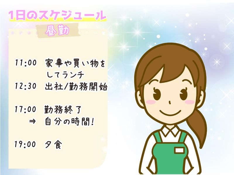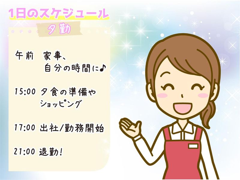 勤務時間 | シフト制 勤務時間詳細 ①8:00~12:30 ②12:30~17:00 ③17:00~21:00 *上記の時間帯で週3日~OK! *時間・曜日・日数の相談もOK◎ ★扶養内勤務OK! ★学校終わりの勤務も大歓迎! |