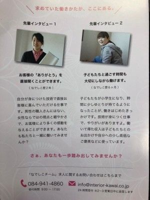職種/仕事内容 | 仕事内容 クロス、塗り壁、カーテン工事の補助作業ならびに現場の片付けや清掃をしていただきます。 【プライベートと仕事の両立を大切にしています。】 ☆仕事に前向きに取り組めるように、家庭の都合やお子さんの都合など、プライベート時間の変化に合わせて、1日3時間~8時間、週3日~、時間や日数を増減するなど、あなたらしい働き方を全面的にサポートします。 ☆お子さんの病気などで急に出勤できなくなることもあるかと思いますが、理解ある環境で不安なく働くことができます。 ☆20代、30代の女性も活躍中です☆ この求人は採用強化案件です。 [醍醐味] 自分の仕事が形になっていく様子を間近で体験できます☆ [こんな人が活躍] 20代、30代の女性も活躍中です☆ 異業種からの方も活躍中です☆ |