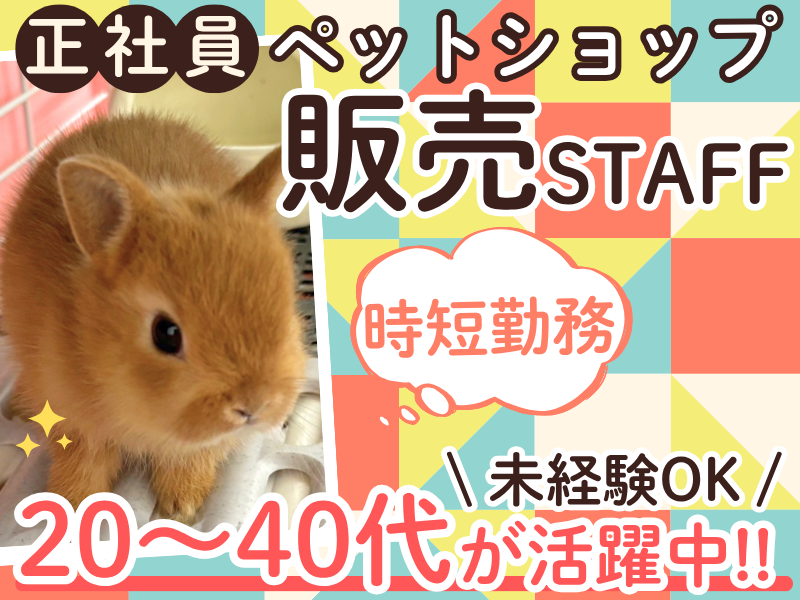 対象となる方 | 求めている人材 ◆未経験大歓迎! ◆高卒以上 ◆20代~40代が活躍中! <こんな方を歓迎します!>  ̄ ̄ ̄ ̄ ̄ ̄ ̄ ̄ ̄ ̄ ̄ ̄ ̄ ̄ ̄ ̄ ◆土日祝勤務できる方 ◆長期勤務できる方 ◆生き物が好きな方 ◆臨機応変に働ける方 ◆明るい対応ができる方 ◆将来独立を考えている方 <先輩スタッフからのメッセージ>  ̄ ̄ ̄ ̄ ̄ ̄ ̄ ̄ ̄ ̄ ̄ ̄ ̄ ̄ ̄ ̄ このお仕事で面白いと感じる瞬間は たくさんあります。 ウサギやハムスターの赤ちゃんと 触れ合うのは、癒しにもなりますね。 お客様から「この子可愛くなったでしょ~」 と声をかけて頂けるのも嬉しいですよ。 また、生き物の体調管理は 特に気をつけています。 赤ちゃんは体調を崩しやすいので、 毎日しっかり チェックしなくてはいけません。 お仕事を楽しむコツは、 ただの販売スタッフに徹しないこと。 楽しく過ごせるような提案や、 飼育のサポートをすると喜んで頂けます。 もちろん、分からないことは 先輩に相談してもらえれば大丈夫。 一緒に成長していきましょう! |