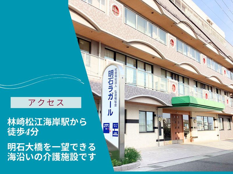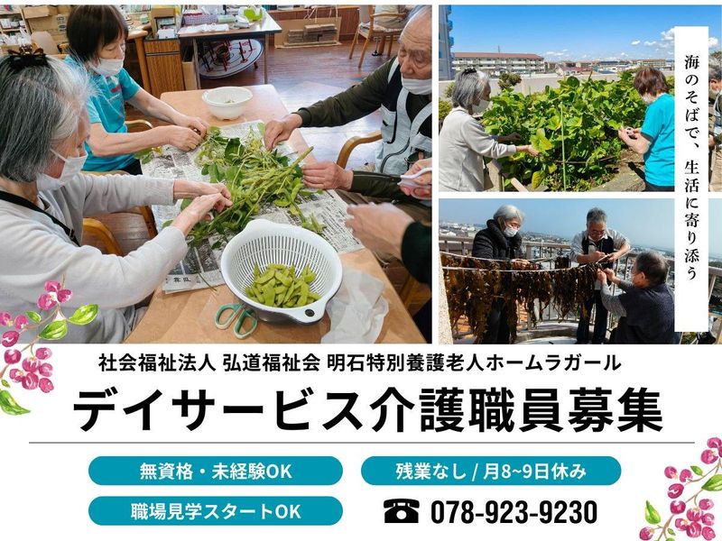 職種/仕事内容 | 仕事内容 / 増員募集◎ 介護職未経験・無資格OK & 歓迎! ✅無資格からスタートして1年後には 初任者研修資格を取得している方がほとんど! 資格取得して時給もUPできます★ (資格取得支援制度あり/会社全額負担) ✅1日 ✅「職場見学から決めたい」もOKです ご応募お待ちしております♪ \ 明石海峡を望む海沿いにある当施設。 夕方には明石大橋のライトアップされ のびのびした環境で働けます。 利用者への見守り強化に向けて、 2023年には、介護ロボ(見守りスキャン)導入してます! 施設の雰囲気は是非、 当社のHPからチェックしてみてください★ 「ラガール新聞」やSNSで レクリエーションの活動風景など載せてます◎ ▼業務内容  ̄ ̄ ̄ ̄ ̄ ̄ 利用者様が、1日イキイキと過ごせるように サポートしていただきます。 1日の受入定員:20~25名 具体的には ・利用者様を車で送迎 ・身体介護(食事・入浴等の介助) ・生活援助(洗濯・掃除) ・レクリエーションの企画や趣味活動のサポート業務。 ┗レクを考える行事担当のスタッフもいるので、 「レク考えるのが苦手」という方もご安心ください! <1日の流れ> 08:45 利用者さん宅へ迎えに車移動 09:00 健康チェック 09:30 入浴・作業療法(機能訓練・趣味・クラブ活動 ) 12:00 昼食 13:30 レクリエーション 15:00 ティータイム・おやつ 15:30 生活リハビリ 16:00 体操 16:30 帰宅準備・利用者様宅に送り届け 17:00 事務処理 17:15 退勤 - 今いるスタッフについて - デイサービススタッフは、 30代~50代後半の方10名が在籍中! 未経験・中途入社の方も多数! ”残業なし”で無理なく働けますよ◎ 施設内介護職員の仲にも 介護資格は無いまま入社し、当社で半年ほどかけて 初任者研修を取った方が多数います。 そこからさらに5年以内に国家資格である 「介護福祉士」資格を取った方などもいます!! 働き方やお仕事の流れなど、 ご不明点があればお気軽にご相談下さい。 |