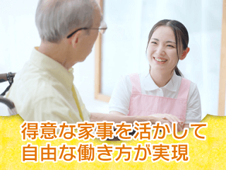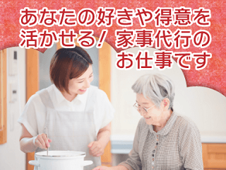 職種/仕事内容 | 仕事内容 高齢者をはじめ若い方にも在宅での快適なご生活を送っていただくため、お客様のご自宅へ訪問し、家事代行やお体のケアを行います。 介護保険に縛られない自由な自費の家事代行(生活支援)サービスです。 日給パートでのお仕事なので、お客様のお宅に訪問しての家事のお仕事が無い時間も給与発生します。 空いた時間は、事業所に戻ってきていただいてお客様の情報入力や、記録書の整理等簡単な事務作業を行って頂きます。 ≪1日の仕事の流れ≫ (例) 9:00ー11:00A様のお宅に訪問して家事のお仕事(掃除・洗濯・買物) 11:00-12:00B様のお宅付近へ移動 12:00-13:00お昼休憩 13:00-15:00B様のお宅に訪問して家事のお仕事(買い物・調理) 15:00-16:00C様のお宅へ移動 16:00-18:00C様のお宅に訪問して家事のお仕事(夕飯の調理) 【家事代行】 □調理、調理補助 □掃除 □洗濯 □買物代行 □引っ越し後のお部屋の片づけ など 未経験でも職員が丁寧に研修を行っていきますので、安心して働けます。 研修制度もたくさんご用意しております |
