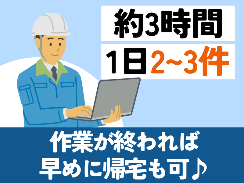勤務時間 | 固定時間制 勤務時間詳細 実働時間:1日あたり8時間 平均勤務日数:1ヶ月あたり22日 〜 24日 【勤務時間】 9:00~18:00(実働8時間) ※残業ほぼナシ ※作業場所が遠方の場合は早出あり (早出時間に合わせて終了時間も早く終わるよう調整) ※作業が終わり次第、早上がりも可 |