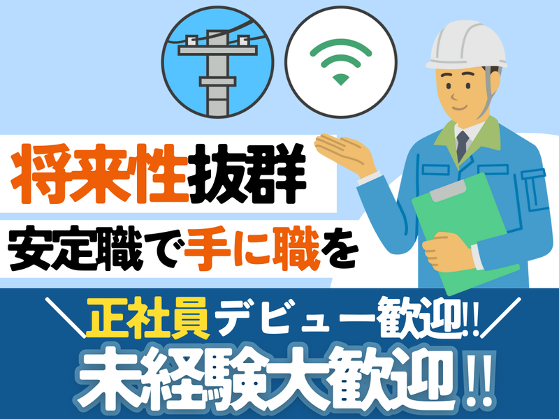 対象となる方 | 求めている人材 【 必須 】 ■要普通自動車免許(AT限定可)/運転ができる方 (中型免許保持者優遇) \・。✨ 未経験大歓迎! ✨。・/ フリーターさん、 初めての正社員デビューも大歓迎! 【 こんな方にピッタリ! 】 ■コツコツ作業に取り組める方 ■チームで協力して働ける方 ■将来性のある仕事を探している方 ■正社員で腰を据えて働きたい方 ·。✨ 20代30代若手活躍中! ✨。· 「安定して稼ぎたい」 「未経験から正社員になりたい」 そんなあなたを全力でサポートします! 一緒に未来をつくる 通信工事のプロを目指しませんか? |