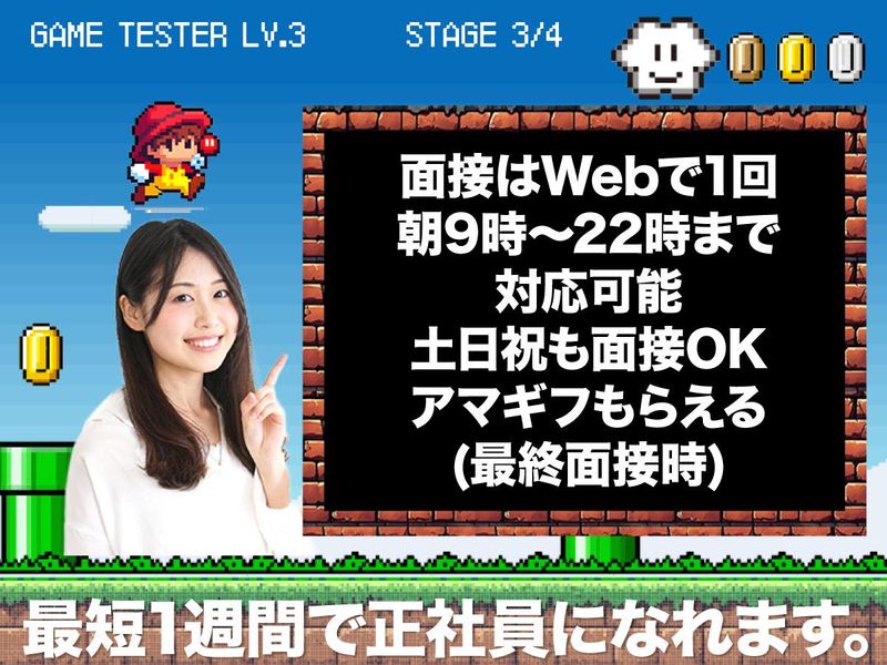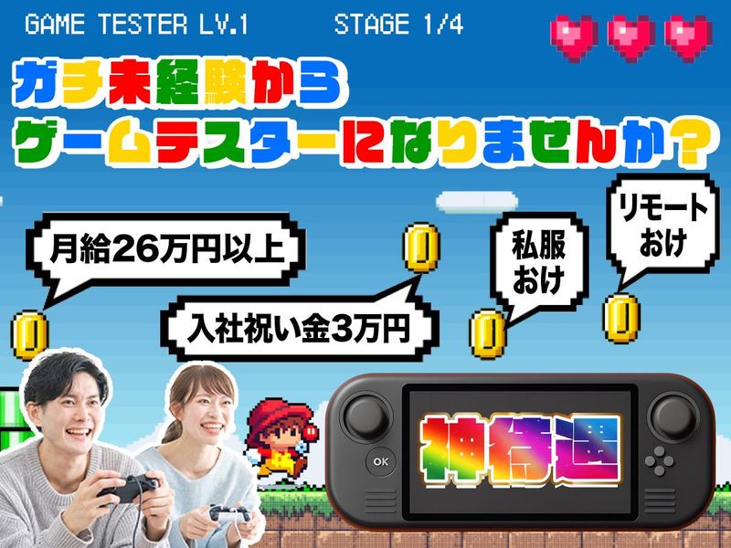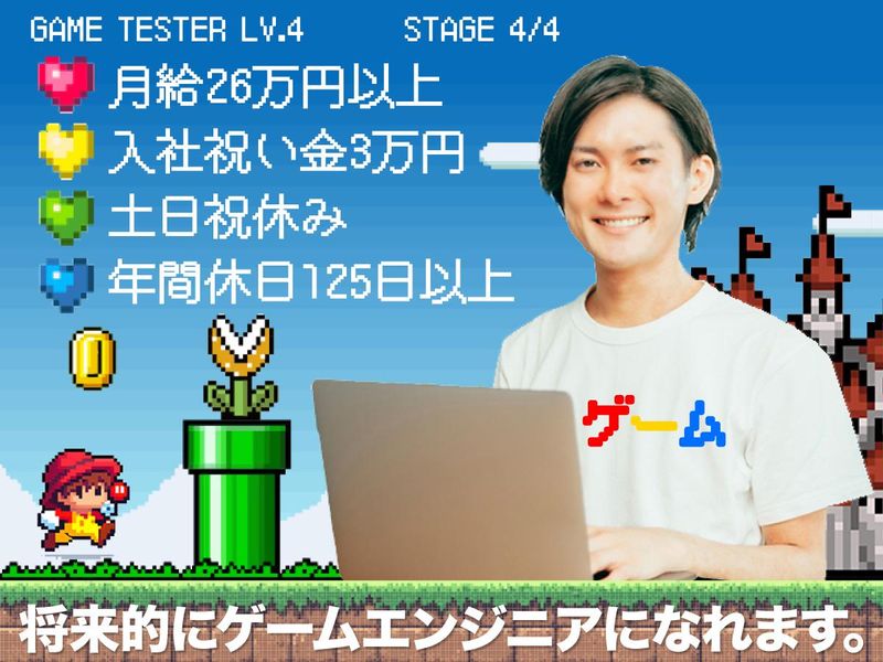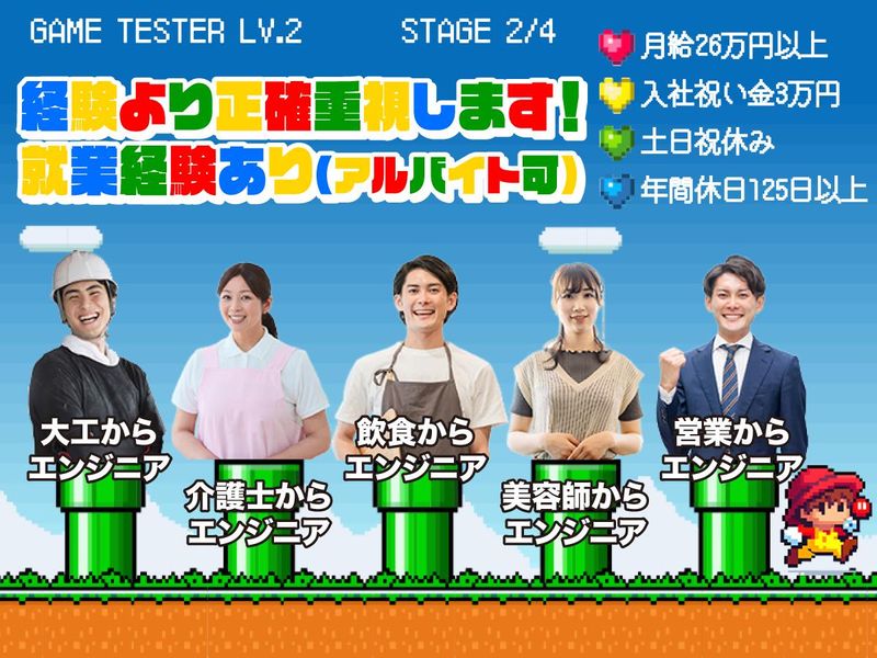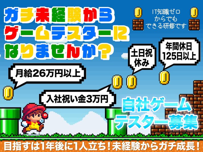 職種/仕事内容 | 仕事内容 ◎この求人のPOINT ━━━━━━━━━━━━━━◆◇◆━━ ✅未経験からガチ成長できる! ✅月給26万+入社祝い金3万◎ ✅年間休日125日以上+基本定時退社可 ✅リモート&私服おけ!神待遇! ✅ゲーム好きを活かしてエンジニアデビュー ━━◆◇◆━━━━━━━━━━━━━━ 2014年の設立以来、成長を続け、 社員数230名、売上15億円(2025年見込) の規模にまで拡大している当社。 成長を続ける理由は、 多くの未経験者をIT業界の プロフェッショナルへと育てているから。 「好き」を活かして、 将来役に立つスキルを習得しながら、 ワークライフバランスも充実させませんか。 【仕事内容】  ̄ ̄ ̄ ̄ ̄ ̄ ̄ ̄ ̄ ̄ ̄ ・ゲームの単体・結合・総合テスト ・ゲーム・アプリ・システム等のテスト業務 ・テスト結果の集計 ・バグの調査・修正 ・システムの改修 ※プログラマへのキャリアアップも可能。 リリース前や公開直後のアプリ・ゲームを実際にプレイしながら、 最初は「バグの探し方」や「ゲームの基本用語」を学んでいただきます。 「マニュアル通りに進められるか」 「不具合が発生していないか」 といった観点で確認していく、ゲームの完成度を高める大切な役割。 達成感を得られるやりがいのあるお仕事です! 【キャリアステップ例】  ̄ ̄ ̄ ̄ ̄ ̄ ̄ ̄ ̄ ̄ ̄ ▼ゲームテスターとしてスタート ▼デバッカーやゲームプログラマに ▼アプリ開発やゲーム開発のプロフェッショナルに! コンシューマゲームやオンラインゲームはもちろん、アクションゲーム、シューティングゲーム、大規模RPGなどメジャータイトルまで携わることが出来ます。 【様々なキャリアアップが可能】  ̄ ̄ ̄ ̄ ̄ ̄ ̄ ̄ ̄ ̄ ̄ ̄ ̄ ̄ ̄ ゲームだけに留まらず、システムやアプリ設計・開発、ネットワークの構築などをへのキャリアチェンジや、ゆくゆくは、生成AIなどの最先端技術に携わることも可能です! |