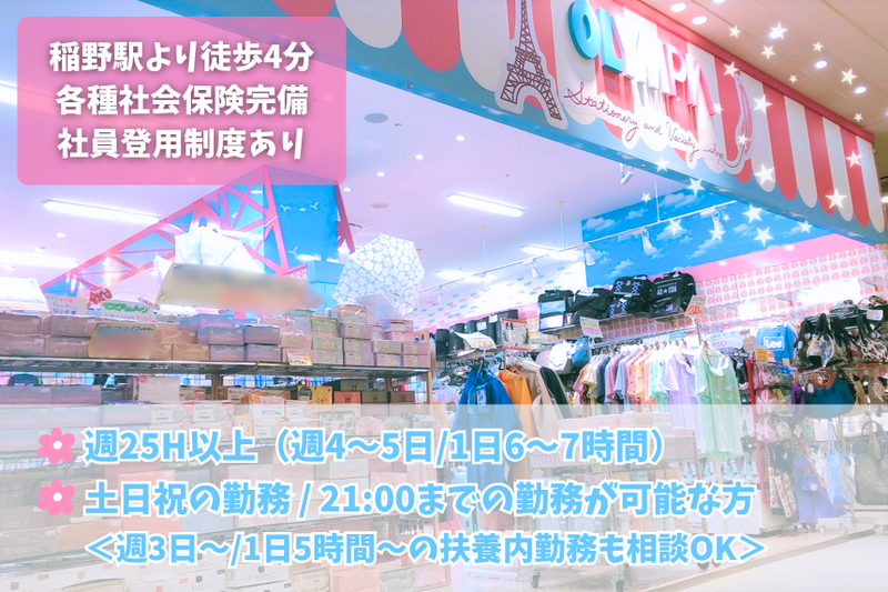 職種/仕事内容 | 仕事内容 ショッピングモール内のバラエティ雑貨店で働くスタッフの募集です。 主にレジ・ラッピングといった接客と、商品の検品・陳列・仕入れなど売り場づくりのお仕事をしていただきます。 初めはレジや接客といった基本的なことからスタートし、いずれは商品の発注等もお任せしていきます。 店内にはファンシー雑貨をはじめ、文具・キャラクター商品・アクセ・コスメ・お菓子など遊び心を刺激するアイテムがたくさん! 定番のカワイイ商品はもちろん、最新のトレンド商品も続々入荷するので、小さなお子様から大人の方まで幅広い層のお客様が来店されます。 弊社はただモノを売るだけでなく、「カワイイは"他者への応援"」と捉え、お客様の楽しみと絆づくりのお手伝いを通して世の中を明るくすることのできる企業を目指しています。 そういった想いに共感していただける方、ぜひご応募お待ちしております! 「オリンピアに行けば絶対カワイイものがある!」と思ってもらえるお店を一緒につくっていきましょう! |