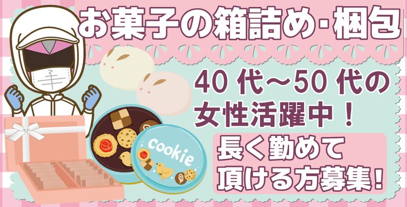 職種/仕事内容 | 仕事の内容 【あわら市からも通いやすい!石川県加賀市でのお仕事♪】 \有名観光菓子の包装・箱詰めスタッフ募集!/ 日本各地のリゾート地や有名テーマパークで販売されるお菓子を作っている工場でのお仕事です! 饅頭・クッキー・ラングドシャなど、多種多様なお菓子を扱います♪ ≪主なお仕事≫ ・お菓子の箱詰め・梱包作業(ライン作業) ・機械オペレーター業務(タッチパネル操作、メンテナンス、資材補充など) 現場では女性が多数活躍中! ≪ここがポイント!≫ ・ 快適環境:1年中、一定温度に保たれた工場で作業♪ ・ 充実のサポート:最初の1週間は先輩がマンツーマンで指導! ・ 安心の職場:2023年10月にHACCP認定取得の工場◎ ・ 働きやすい環境:無料駐車場完備、制服貸与、鍵付きロッカーあり ≪こんな方におすすめ!≫ ・ モクモク作業が好きな方 ・ 立ち作業が苦にならない方 ・ お菓子が大好きな方♪ ★ご注意ください★ 以下に当てはまる方は業務が難しい場合があります。 ・ ライン作業が苦手な方 ・ 立ち仕事や軽い荷物の運搬が難しい方(最大8kg程度) ・ アレルギーがある方(小麦、粉体、消毒用アルコールなど) ・ 甘い香りに敏感な方 長く安心して働ける職場です! ご興味のある方はお気軽にお問い合わせください♪ ★本求人にご興味をお持ちの方は、応募する!より必須項目記載の上、 お問合せ下さい。 (お電話でのお問合わせ先:0120-67-3244 ※平日9時00分~18時00分) |