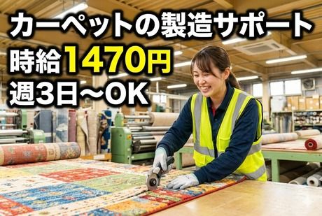 職種/仕事内容 | 仕事内容 【お仕事内容】 玄関マットやオーダーマットの ・ カーペットの裁断・成形 ・ 梱包作業 など 未経験からスタートOK! モクモク作業が好きな方にピッタリ♪ 【ここがPOINT!】 ・シフトの柔軟性◎ ・週3日~勤務OK ・週3日勤務の場合は時給1600円 ・ライフスタイルに合わせて働ける自由度の高さが魅力 ・3つの時間帯から選択可能(早番・日勤・遅番) ・自分に合った時間で働けるので続けやすい! ・パートでもしっかり稼げる ・未経験OKの軽作業 ・特別なスキル不要、モクモク作業が中心で始めやすい ・土日祝休みで私生活と両立しやすい ・家庭やプライベートの予定が立てやすい環境 ・安定企業で安心勤務 ・業務用マットの製造販売を行う企業で長期安定◎ |