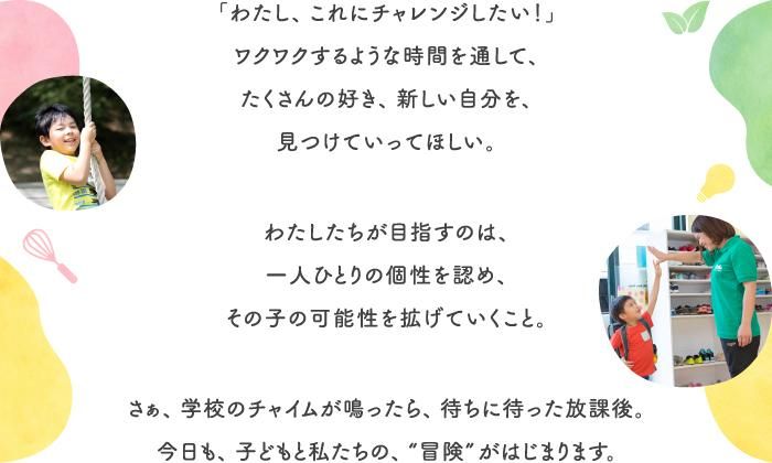 対象となる方 | 求めている人材 下記①~③のいずれか1つに該当する方 ①心理・社会・体育・社会福祉・芸術・音楽・教育学部のいずれかを卒業(短大・大学・大学院) ②教員免許・放課後児童支援員・保育士・社会福祉士のいずれかを持っている ③学童保育・児童館や保育園、幼稚園、学校、児童養護施設、児童発達支援・放課後等デイサービス等での勤務経験がある ※第二新卒OK ※2026年4月入社まで募集中 |