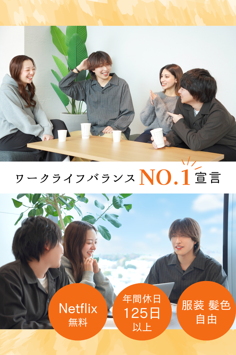 職場環境・雰囲気 | 職場環境 年休125日以上の完全週休2日制で土日祝休みのため、プライベートとの無理のない両立が可能です☆福利厚生も上場企業並みに充実しており「Netflix無料」などユニークなものも◎プライベートで楽しめる140万件以上の優待サービスも利用できます。 喫煙所:喫煙所あり(屋内) オフィス内分煙(喫煙ブースあり) |