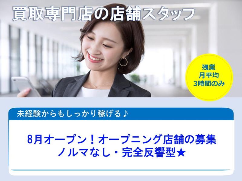 対象となる方 | 求めている人材 ✅未経験歓迎 ✅知識・経験不問 ✅高卒以上 ✅普通自動車免許必須(AT限定可) / 20代・30代スタッフ活躍中! \ <歓迎条件> ◆営業経験者 ◆接客経験者 ◆店舗運営経験者 ◆ブランド品や貴金属に興味がある方 ◆チームで働くことが好きな方 ◆コミュニケーションを取るのが好きな方 <こんな方におすすめ> ◆安定した基本給とインセンティブでしっかり稼ぎたい方 ◆キャリアアップを目指したい方 ◆人と接することが好きな方 ◆新しいことにチャレンジしたい方 ◆プライベートと仕事のバランスを大切にしたい方 年齢に関係なく、やる気と向上心のある方を歓迎します。 女性スタッフも活躍中! お客様からの評価も高いです✨ 将来的には店長昇格など、キャリアアップの道も開かれています。 ぜひあなたの力を当社で発揮してください! |