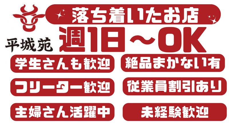職種/仕事内容 | 仕事内容 あなたも知ってるかも!? 業界トップクラスの知名度の「平城苑」 だから叶う柔軟×お得な人気バイト♪ ╭━━━━━━━━━━━━━━╮ ★ 2週間毎の希望シフト制 ★ ╰━v━━━━━━━━━━━━╯ 週2日からライフスタイルに合わせて 希望のシフトに対応◎ 土日祝出られる方は積極採用中♪ 月2回シフトの希望が提出できるのも お勧めpointの1つ♪ *** ╭━━━━━━━━━━━━━━━╮ ★ 平城苑の絶品賄い1食100円 ★ ╰━v━━━━━━━━━━━━━╯ 平城苑の人気まかないが1食100円で 食べられる♪ 働きながら節約にもなると大好評♪ 人気焼肉店の賄いは絶品です◎ *** ╭━━━━━━━━━━━━━━━╮ ★平城苑全店で使える20%OFF券★ ╰━v━━━━━━━━━━━━━╯ 休日に家族や友達との使用ももちろんOK! 平城苑全店舗で使える割引券も大好評♬ *** ⋆⸜キッチン業務全般をお任せします!⸝⋆  ̄V ̄ ̄ ̄ ̄ ̄ ̄ ̄ ̄ ̄ ̄ ̄ ̄ ̄ ̄ ̄ ̄ ̄ ・肉や野菜のカット、盛り付け ・サラダやデザート簡単盛り付け ・スープや石焼ビビンバの調理 ・洗い場作業 ・料理の仕込み全般 など。 ◤ ̄ ̄ ̄ ̄☎⋆.✩ ̄ ̄ ̄◥ お電話でのご応募も歓迎 ℡/043-307-8529 ◣__________◢ ⋆⸜未経験スタート大歓迎!⸝⋆  ̄V ̄ ̄ ̄ ̄ ̄ ̄ ̄ ̄ ̄ ̄ ̄ ̄ ★研修ありで安心♪ まずは、洗い場からスタート! そのあとは簡単な前菜などの 盛り付けを覚えていただきます。 すべての指導は社員が担当するので、 未経験でも安心して始められますよ! 現在活躍中の半分以上が未経験スタート◎ まずはお気軽にご応募ください! 一緒に働ける日を楽しみにしています♪ |