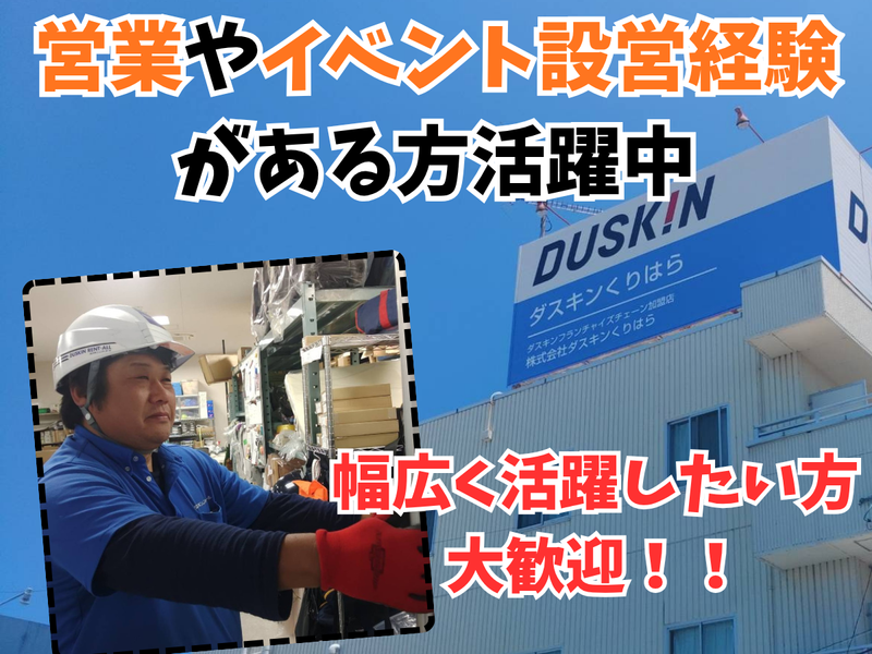 職種/仕事内容 | 仕事内容 <営業経験のある方大歓迎‼> ★ダスキンレントオールの企画・運営スタッフ★ 当社が運営している ベビー用品・イベント備品の レンタルを行う イベント設営、運営を含めた お仕事内容をお任せします‼ 将来的にはダスキン事業の すべてに精通していただき、 幅広い活躍を期待します! ◤具体的には◢ ・家庭市場 主にベビー用品のお貸出し ・事業所市場 イベント備品のお貸出し 例)入社式、株主総会、花火大会、夏まつり、防災訓練、産業祭、農業祭、 各種セールスプロモーション、 レクリエーション (クリスマス会・新年会)等で 必要な商品のお貸出しです。 家庭市場と違うところは、 商品をお貸出しするだけでなく、 各種イベント会場の設営・撤去 ※場合によっては運営に携わることもあります。 * 実際の作業内容 ・店内でのPC入力 ・営業(電話・訪問) ・商品準備(メンテナンスも含む) ・会場設営・運営 作業分担はほとんどありません。 全てに携わっていただきますが、 大口案件は複数名で対応します。 入社後の勤務先は通勤時間を考慮して ・ダスキンレントオール東松山ステーション ・ダスキンレントオール川越ステーション ・ダスキンレントオール上尾ステーション 上記のいずれかになります。 株式会社ダスキンくりはらは ダスキンのフランチャイズチェーンとして 埼玉県及び茨城県下に、 ダストコントロールの他、 ミスタードーナツなど 幅広く展開しているフランチャイズ企業です! |