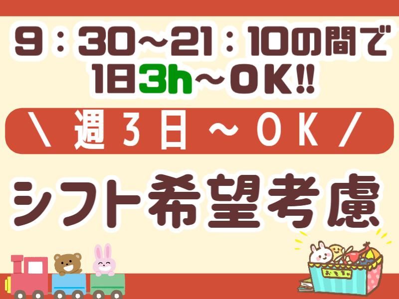 勤務時間 | シフト制 勤務時間詳細 ■9:30~21:10の間で1日3h~OK!! ※時間帯や曜日などご相談ください。 ●9:30~18:00や12:00~21:10の勤務できる方、大歓迎‼ ☆友だち同士の応募も歓迎です。 ☆土・日・祝働ける方、大歓迎です。 ☆「平日のみ」「土日祝のみ」可能です。 気軽にご相談ください! |