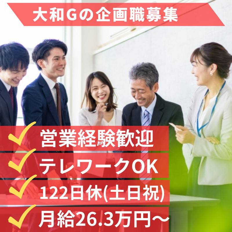 対象となる方 | 求めている人材 20代後半・30代の営業経験者が多数活躍中! ノルマや数字に追われる環境を卒業し、 安定した「企画・事務キャリア」へ転身しませんか? 大和ハウスグループの安定基盤で、 あなたの経験を「調整力」として評価します! -------------------- 【必須条件】 ・社会人経験3年以上 ・基本的なPCスキル (WordやExcelで書類作成できる程度) ・営業や顧客渉外などの人と関わる職種経験 (業界不問/法人・個人問わず) ※「売る」経験そのものではなく、 お客様や関係者と円滑にやり取りをする 「コミュニケーション能力」を重視します。 【活かせる経験・スキル】 以下のいずれかの経験がある方は、 即戦力として優遇・歓迎いたします。 (A) 営業・顧客折衝のご経験 ・法人営業、個人営業のご経験 ・顧客渉外経験がある方 (B) 事務・企画・管理のご経験 ・契約書を作ること・読むことが得意な方 ・マーケティングや企画経験がある方 ・業務フローの改善や契約書管理に携わった経験 (C) 業界経験・PCスキル ・不動産業界経験のある方 ・WordやExcelなど業務で使う経験 【こんな方におすすめ!】 ・主体的に仕事を行い評価されたい方 ・営業職から転職を考えている方 ・営業経験を活かしつつ、デスクワーク中心の業務で ワークライフバランスを整えたい方 ・安定した環境で、長くキャリアを積みたい方 ・大和ハウスグループの安定基盤で、 自分の企画がビジネスに貢献する手応えを感じたい方 【歓迎資格】 ・管理業務主任者 ・マンション管理士 ・宅地建物取引士 -------------------- 【採用担当より】 「営業経験はあるけど、企画や事務は初めて…」 という方もご安心ください。 この仕事で最も大切なのは、 専門知識よりも「相手の意図を汲み取る力」です。 契約書の作成も、新しい企画の立案も、 根底にあるのはあなたのコミュニケーション能力。 そのスキルを、これからは数字のためではなく、 「快適なマンション暮らし」のために活かしてください。 |