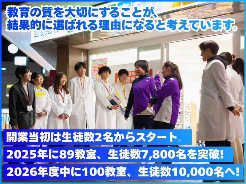 職場環境・雰囲気 | 職場環境 / 2027年2~3月にも 8~10教室新規開校予定! \ 開業当初、 生徒数2名からスタート ▼ 2025年に89教室、 生徒数7,800名を突破! ▼ 2026年度中に100教室、 生徒数10,000名を 目指しています! 喫煙所:なし(敷地内全て禁煙) |