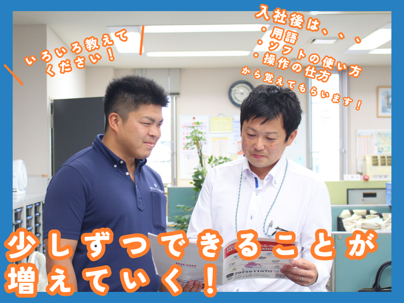 職種/仕事内容 | 仕事内容 お客様の業務をより効率的にするため、自社のパッケージソフトをご提案しています。 納品後のお客様には定期的に訪問したり、問い合わせがあれば対応したりと、長期的に関係を築いていくのがこの仕事の特徴です。リース契約の割合も多く、更新のタイミングで定期的に案件が発生します。新規開拓もありますが、入れ替えのタイミングにも継続的にお問い合わせをいただけるような関係をつくることが大切です。 【入社後は】 ・用語の理解 ・ソフトの使い方 ・操作方法 といった基礎をしっかり習得していただき、ある程度対応できるようになったら独り立ちです。 少しずつできることが増えるにつれて、任される仕事も徐々に多くなり、やりがいも広がっていきます。最終的には、訪問から納品までの一連の業務を一人でこなせるように、上司や同僚がしっかりサポートしますので、安心して成長できます。 |