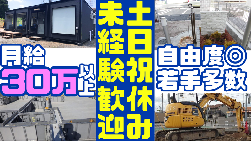 職種/仕事内容 | 仕事内容 〈 未経験でも月給30万円~スタート 〉 〈 完全土日祝休み・日勤のみ 〉 創立して8年目とまだ新しく意見し易い! / 業績好調の安定企業◎ 未経験からの業界デビューを応援! \ ◤ 土日祝休み/9~17:00 現場作業では珍しい土日祝休み ◢ ・・・・・・・・・・・・・・・・・・・・・・・・・・・・・・・・・・・・ 残業も必要最低限の働きやすい環境を 整えています! 仕事終わりの自分のプライベート時間 家族との時間も予定を立てやすい♪ ワークライフバランスを取りながら 今後も安定して続けられるように あなたの意見もどんどん取り入れます! ◤ 未経験も丁寧サポート 先輩との関係性も良好のチーム作業◢ ・・・・・・・・・・・・・・・・・・・・・・・・・・・・・・・・・・・・ 外構(エクステリア)工事・基礎工事 などの現場作業をお願いします! 現場スタッフは現在11名が活躍中◎ ●具体的には… ✓毎朝、松戸市紙敷(事務所・置き場) に集合し、現場へ向かいます。 ※現場は千葉県東葛地域がメイン。 その他千葉市~房総方面や茨城県 ✓2~3人の1組でチームを組んで 業務を行います! ★希望があれば基礎工事から外構工事、 地盤改良工事まで対応しているので、 1つの工事に偏らずに 幅広い業務を学べるのも魅力の1つ! ▮基本給ベースアップ!  ̄ ̄ ̄ ̄ ̄ ̄ ̄ ̄ ̄ ̄ ̄ ̄ 月給30万円以上のスタート! 最大月給は40万円からのスタートです◎ 経験やスキル、頑張りが給与に直結する 風通しの良い評価体制も自慢! *** ▮やりがいも充分!  ̄ ̄ ̄ ̄ ̄ ̄ ̄ ̄ ̄ ̄ ̄ ̄ 私たちの仕事は、建物の土台を作る 基礎工事から外構(エクステリア)工事 まで様々です。 作業中は2、3人のチームで お互いにサポートするので、 体への負担も軽減◎ 仕事を通じてあなただけの スキルを身に付け高められます。 1人で現場を回せるようになれば、 "月給60万円"も可能です。 スタッフにはストレスなく 働いてほしいから、 【給与日払い】や【社員寮】への 入居相談も受付けていますよ。 創立して8年目とまだ新しく、 ルールなどが定まっていません。 あなたの経験で ここはこうした方が良いのでは? という部分があれば どんどん意見を出して頂いて大丈夫! 意見を出し合い、 より強い会社づくりに参加して下さい! |