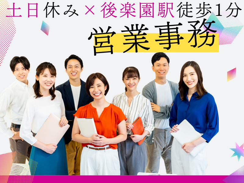 職種/仕事内容 | 仕事内容 ・営業をサポートする社内での事務業務になります。 ・見積作成 ・契約書作成 ・取引先への対応 ・電話応対 ・メール対応 ・受発注データ入力 ・請求書作成 ・購買業務 などが主な仕事です。 難しい作業も特にないので、事務経験が浅い方やブランクある方も安心してください。 <<安定感抜群>> 弊社が扱う商材は、建設現場で使用される オフィス什器備品(机・椅子・ロッカーなど)がメイン。 建設工事はこの先も無くならないので、仕事は安定しています。 <<アクセス抜群の好立地>> ◎後楽園駅から徒歩1分! ◎春日駅からも徒歩4分! 文京区の中心エリアで通いやすさバツグン! 「駅チカで働きたい」 「通勤ストレスは避けたい」 そんな方にピッタリです。 <<働き方も安心&安定♪>> 完全週休2日制! 土日がお休みだから、予定も立てやすい◎ プライベートも充実! しっかり休めるから、 オンオフのメリハリをつけて働けます。 「趣味の時間も大事にしたい」 「家族との時間も確保したい」 そんな方にもぴったりの環境です! |