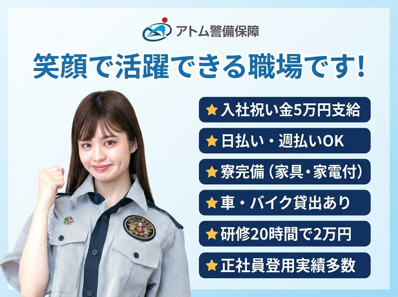 職種/仕事内容 | 仕事内容: ―――――――――――――――――― 【新着!!】人気の施設警備 ご応募お早めに・・☆ ―――――――――――――――――― 日払い・週払い・前払いOK 寮完備・車や携帯の貸出あり etc... 嬉しい制度がたくさん! ―――――――――――――――――― お電話での応募も受付中! お問い合わせもお気軽にどうぞ☆ TEL:090-2162-1900 ―――――――――――――――――― 【お仕事内容】 オフィスビルや商業施設内で、 入退館確認や、異常がないかの確認、 館内の巡回などを行うお仕事です。 施設内の警備なので天気や気温に左右されずに しっかり稼ぐことができますよ!!! 警備業界が初めての方も大歓迎! 研修があるので、安心して始められます。 資格取得もできるので 未経験からチャレンジしたい方にもおススメです! 《入社3ヶ月目のBさんの収入例/日勤》 月22日勤務(週5日程度)×時給1200円×1日8時間 ⏩️月収21万1200円 *新着求人 *アルバイト・パート募集 |