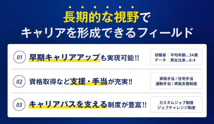 待遇・福利厚生 | 【保険制度】 雇用保険、労災保険、健康保険、厚生年金 【福利厚生】 待遇・福利厚生 【福利厚生】 ●交通費支給(月3万円まで) ●社用車支給 ●携帯電話・PC支給 ●産休・育休・介護休制度 ●住宅購入・建築・リフォーム補助(社割)あり ◎カスタムジョブ制度 子育て、介護などのライフイベントに応じて 働き方を柔軟に変えられるオリジナル制度。 将来的にライフステージの変化に合わせて 1日6hの時短勤務や週休3日もといった働き方も可能です。 ◎ジョブチャレンジ制度 入社後に部署の移動や職種の変更を申し出ることができる、 社員のキャリアアップを目的とした制度です。 多くの社員が望むままのキャリアを叶えています。 |