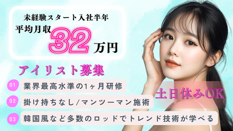 職種/仕事内容 | 仕事内容: ✅ 月40万以上も可能◎頑張りはインセンティブで毎月還元! ✅ 希望休3日OK・月8日休みの柔軟シフト ----------------------------- ✅ 全国100店舗以上展開する大手アイサロン◎ ✅ マンツーマン施術で丁寧な接客が可能! ✅ 独立支援・講師登用制度あり!キャリア選択ができる環境 ----------------------------- most eyesは「眉とまつ毛から印象をデザインする」専門サロン。 “美容の仕事が好き。でも、ずっと無理なく続けたい”―― そんな想いを叶えられる環境がここにあります。 ----------------------------- 【✨具体的な仕事内容】 ・まつ毛パーマ/パリジェンヌ/アイブロウ施術 ・カウンセリング・デザイン提案 ・施術後のフォロー・次回予約案内 ・清掃・備品管理などのサロン業務 美容師免許があれば、経験は問いません。 研修担当が基礎理論・装着技術・接客まで一貫サポートします。 ----------------------------- 【✨1日の流れ】 10:00 出勤・朝礼・当日の予約確認 ↓ 10:30 開店/施術準備 ↓ 11:00 お客様施術(カウンセリング〜施術〜アフターケア) ↓ 13:00 休憩(60分) ↓ 14:00 午後の施術・顧客管理 ↓ 18:30 店内清掃・備品確認 ↓ 19:00 退勤 ----------------------------- 【✨社員インタビュー_24歳女性】 ──入社のきっかけは? 「美容の仕事は続けたいけど、前職では長時間労働がきつくて…。 most eyesなら自分の時間も大切にできると感じ、入社を決めました。」 ──入社して感じた魅力は? 「研修がとても丁寧で、できるようになるまで寄り添ってくれました。 未経験でも安心してデビューできる環境だと思います。」 ──仕事のやりがいは? 「“前より自信が持てた!”と笑顔で言ってもらえるのが嬉しい瞬間。 美容の仕事を“楽しい”と思える職場に出会えました。」 |