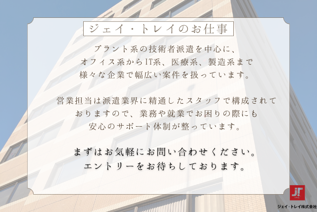 職種/仕事内容 | 仕事内容 \▽未経験からCADが学べる!週4・時短勤務OKと好条件がそろっています▽/ 3月からプロジェクト開始!入場は2月~4月開始でも相談できます!募集枠1名なのでおはやめにどうぞ! ▼△▼お仕事内容▼△▼ 高速道路の監視カメラを設置するプロジェクトの事務所にて、電気配線図のCADオペレーターのお仕事です。 [メイン業務] ・AutoCADを使用した作図業務 [事務・庶務J業務] ・プロジェクトに関わるかんたんな書類作成、データ入力 (テンプレートを、宛先など一部変更した書類をWordで作成、決められたフォームに数値データを入力) ・電話の取り次ぎ (名前や要件を控えて、社員スタッフさんへ伝言) ・荷物の受け取り (社内に届いた宅配便を受け付けます) ・資材の管理チェック (社内で保管している部品の数量確認・在庫チェック/監視カメラ設置に伴う部品なので、大型のものではありません) <使用ソフト>Word、Excel・メールソフト ◆◇◆◇職場環境◆◇◆◇ 職場は工事現場にあるのような事務所ではなく、線路沿いに面した営業所ですのでご安心ください! 冷暖房ももちろん完備で快適に就業できます。社員スタッフ10名程の小規模なオフィスですが、 社員さんは日中、外出している事が多く、社内の人数は比較的少なくなります。 皆さん気さくで親切なので、堅い職場というよりも、雑談も交えて丁度良い距離感で、快適な気持ちで勤務できる環境です。 [ご家庭と両立して働けるお仕事をお探しの方も] 主婦・主夫の方、子育て、介護を抱えながらお仕事を探されている方、本当に両立できるか不安もあると思います。 当案件は長年の取引実績もあり、派遣先の社員スタッフさんや職場環境をよくしっておりますので、 両立を希望して働く方が心配する「突発的なお休み」や「平日のお休み調整」にとても理解がある事をお約束できます。 ワークライフバランスを重視して働きたい方にはご安心いただき、エントリー頂ければと思います。 [就業後のキャリアアップ] ・AutoCADの実務をつけてさらに良い条件へステップアップ! ・監視カメラ(電気通信業界)の知識を学び、同業の企業へ正社員として就職も! ・派遣先直雇用の実績もあり、3年後は弊社にて無期雇用に転換し長く働く事も可能です。 ◆◇◆◇◆ジェイトレイで働くメリットって?◆◇◆◇◆ ①実務や資格なしの未経験から、キャリアアップができるお仕事がたくさん! ➁3年経過後の抵触日を迎えた後は、無期雇用に転換して慣れ親しんだ職場でずっと継続可能! ➂大手企業、官公庁、メーカー、IT、医療介護系など、勤務先は色々! ④教育訓練はCADスクール有!スキルを学んで更にキャリアを重ねていく事ができます! ⑤10年以上、人材業界に精通した営業担当・コーディネーターが立場に立って丁寧にサポートします! *-*-*-*-*-*-*-*-*-*-*-*-*-*-*-*-*-*-*-*-*-*-*-*-*-*-*-*-*-*-*-*-*-*-*-*-*-* [来社不要]ご自宅からスムーズにオンライン登録可能・WEB登録・電話登録も実施中 *-*-*-*-*-*-*-*-*-*-*-*-*-*-*-*-*-*-*-*-*-*-*-*-*-*-*-*-*-*-*-*-*-*-*-*-*-* 【変更の範囲】変更なし |
