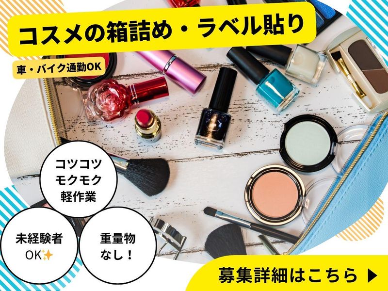 職種/仕事内容 | 仕事内容 ╒━━━━━━━━━━━━━━━━╗ ✨主夫・主婦パートさんが活躍中!✨ 未経験者でも覚えやすいカンタン作業☆ ╘━━━━━━━━━━━━━━━━╝ 【⭐仕事内容⭐】 コスメの箱詰め・ラベル貼りなどの 軽作業メインで未経験者も安心! 手のひらサイズのコスメなので 重たいものは扱いません♪ - \ ✨嬉しい入社後特典アリ✨ / 入社後Quoカード or デジタルギフト券 1万円分の支給あり!!(規定あり) - 化粧品工場内で、梱包や箱詰めなど、 出荷前の仕上げ作業をお願いします。 ・商品にチップやブラシなどを セットする作業 ・付属品がセットされているかの 確認作業 ・成分表示シールが貼られているかの 確認作業 様々な配置がありますが 日によって異なるので、 様々な作業に取り組めます! 弊社の管理者も一緒に作業をしているので わからない事は何でも聞いて下さい♪ 作業中はお喋り厳禁! だからモクモクと集中して 仕事に取り組みたい方におすすめです。 - |