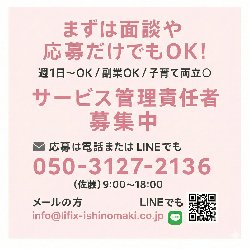 その他 | その他: (1) 石巻の街を支える、社会貢献度の高いお仕事です! 「地元の人に貢献したい」「困っている方の力になりたい」 そんな温かい思いをお持ちの方にぴったりの環境です。 ご利用者様一人ひとりに寄り添い、石巻での豊かな暮らしを支えるやりがいを実感できます。 (2) プライベートも大切に!残業なし&しっかり休めるシフト制 現場のスタッフが「目の前のご利用者様」に集中できるよう、事務作業のほとんどは本社スタッフがサポート! * 残業ほぼなし: ワークライフバランスを重視したい方も安心です。 * 月間休日は相談ください: シフト制で、しっかりリフレッシュできます。 * 希望休OK: お子様の行事やご家族の予定に合わせて、柔軟にお休みが取得可能です! (3) ブランク・未経験・キャリアチェンジも大歓迎! 「子育てが落ち着いたから、もう一度働きたい」 「異業種から、新しいことに挑戦してみたい」 そんな意欲を全力で応援します。 実際に、育児を終えて復職した方や、全く異なる業界から転職してきたスタッフが多数活躍中! これまでの人生経験や、家事・育児で培ったスキルがそのまま活かせるお仕事です。 (4) 宮城県・石巻エリアに特化し、事業を拡大中! 宮城県で障がい福祉といえば『株式会社LIFIX』!! と言っていただけるように私たちは石巻市を中心とした地域密着型のサポートに注力しています。 ご利用者様だけでなく、そのご家族の想いまで汲み取り、地域全体で支え合う仕組みづくりを大切にしています! (5) 「定年なし」で将来も安心!長く安定して働ける場所 障がい福祉業界は景気に左右されにくく、非常に安定した業界です。 年齢を重ねても、培った経験が武器になるため、シニア世代も第一線で大活躍中! 当社には定年制がありません。 「いつまでも現役でいたい」「将来に不安なく働き続けたい」という方に、最適な環境をご用意しています。 雇用形態: アルバイト・パート 給与・報酬: 2,500円 - 3,500円 時給 資格と免許: * サービス管理責任者資格or児童発達支援管理責任者or基礎研修修了者 (必須) |