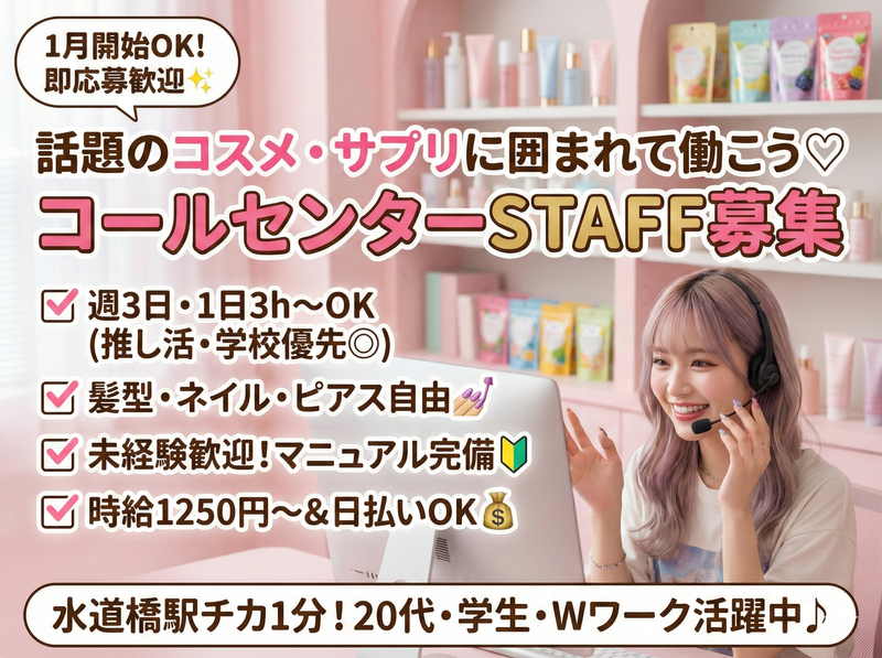 職種/仕事内容 | 仕事内容 ⭐1月からの勤務もOK! 「12月のうちに働く場所は決めたい」など 気軽にご応募・ご相談ください! ⭐求人のポイント ✅ 1日3h〜・週3日〜OK(学校や推し活とも両立◎) ✅ 髪型・髪色自由!ネイル・ピアスOK ✅ 20代フリーター・学生・社会人デビュー組が活躍中 ✅ WワークOK/バイト掛け持ちも歓迎 ✅ ノルマなし&マニュアル完備 ✅ SNSやTVでも話題のコスメ・サプリ商品を扱えます \手厚い研修で 2~3日目にはひとり立ち/ ◆ この仕事、実はとてもシンプル! やっていただくことは、ほぼこの3つだけ。 ①お電話で注文をお受けする ②台本(スクリプト)を上から順に読む ③PCで項目を選択or入力 専門知識は必要ないため、未経験の方でも 手厚い研修を受ければ入社2~3日目には 業務に入れるようになります! ◆具体的な業務内容 ・ご注文受付 ・商品やお届けに関するお問合せ対応 ・会員様への新商品のご案内 ・定期購入のご案内 など たとえば… 「敏感肌なんですけど、この化粧水は使えますか?」 「今飲んでいるサプリと一緒に使っても大丈夫?」 といったご質問に、 マニュアルや商品資料を見ながらご案内していきます。 マニュアルがしっかり用意されているので、 “成分オタク”じゃなくても大丈夫。 「自分でも使ってみて良かったところ」を交えて話すと、 お客様から「そんな使い方もあるんですね!」と 喜んでもらえることも多いです。 ╭━━━━━━━━━━━━╮ ✨ スタッフに聞きました! ╰━━━v━━━━━━━━╯ Q. 志望動機は? A. 「コスメカウンターに行くのが好きで、 どうせ働くなら好きなものをと思いました」(24歳/フリーター) 「アパレルからオフィスワークに変えたくて。 服装自由だし、好きなブランドのコスメの話もできるのが魅力でした」(23歳/元販売) 「授業やサークルの予定に合わせて シフトが組めるから。しかも新作コスメの 情報も知れたりと一石二鳥です」(20歳/大学生) 「サプリで体調が変わった実感があって、 『これ良かったよ!』ってオススメできるのが楽しそうだった」(26歳/OL) Q. 職場の雰囲気は? A. 「推しの話や好きなコスメの話で盛り上がってます」 「“このクレンジングどうだった?”とか、 休憩中にリアルレビュー交換してます」 「わからないことは社員さんやラウンダーさんが すぐフォローしてくれるので安心」 【アクセス】 ╭━━━━━━━━━━━━╮ ✨ 駅チカ&アクセス便利! ╰━━━v━━━━━━━━╯ ◇JR「水道橋駅」西口より徒歩約1分 ◇東京メトロ「飯田橋駅」A5出口より徒歩約7分 ◇都営三田線「水道橋駅」A2出口より徒歩約7分 新宿・秋葉原・市ヶ谷方面からも通いやすく、 学校・本業帰りに立ち寄るスタッフも多数! ⭐研修⭐ ╭━━━━━━━━━━━━╮ 未経験でも安心の30h研修 ╰━━━v━━━━━━━━╯ 敬語・電話対応の基礎 丁寧な言葉遣い 基本的なビジネスマナー 販売・ご案内のコツ など、 **「社会人として通用するスキル」**も まとめて身につきます。 「将来は事務やオフィスワークがしたい」 「接客からキャリアチェンジしたい」 という20〜30代にも人気の研修です。 |