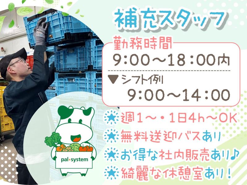 職種/仕事内容 | 仕事内容 【✨お得な社内販売あり✨】 5000円相当の商品が格安数百円で購入できます! 物価が上がっている中、パルラインは家計にも優しいです♪ 。・*パルライン岩槻センター 夏の大募集。・* 基本時給1180円です。 主婦・主夫さん大歓迎です! 一緒にスタートする仲間がたくさん♪ 初めてという方も安心して始められますよ◎ 。・*パルライン岩槻センターの魅力*・。 ✅主夫・主婦歓迎!10代~60代活躍中! ✅未経験可!週1~OK♪働きやすい環境◎ ✅交通費支給、制服貸与、Wワーク・OK! ✅東川口・せんげん台駅から無料送迎バス有 ✅綺麗な休憩室&鍵付きロッカーありで安心 ―――――――――― < お仕事内容 > 段ボールに入った商品を棚に並べて補充! あとは商品の台車を移動するだけ! かんたん&シンプル作業なので、 未経験の方もスグに覚えられますよ♪ \✨未経験スタート大歓迎!✨/ ―――――――――――――― 資格や知識、経験は一切不問です。 CMでもおなじみのパルシステムで安心♪ 大手パルシステムグループで、安定して働きませんか? イチから丁寧に教えていきます◎ \✨通勤らくらく♪✨/ ――――――――――― 東川口駅、せんげん台駅から、 無料送迎バスあり! 車・バイク・自転車通勤もOK! 広々とした駐車場あり♪ \✨働きやすい環境が整っています✨/ ―――――――――――――――――― ・綺麗な休憩室あり ・1人1個使用OK!鍵付きロッカーあり ・フリーWifiあり ・お得な社内販売あり など 働きやすい、好待遇をご用意しています! \✨週1~OK!勤務時間は選べます!✨/ ――――――――――――――――――― ①9:00~14:00 ②9:00~18:00 上記時間帯から選択可能♪ シフトは週1日~OKなので、 無理なく働けますよ◎ 家事や育児などとの両立もしやすいです! シフトはお気軽にご相談下さいね。 |