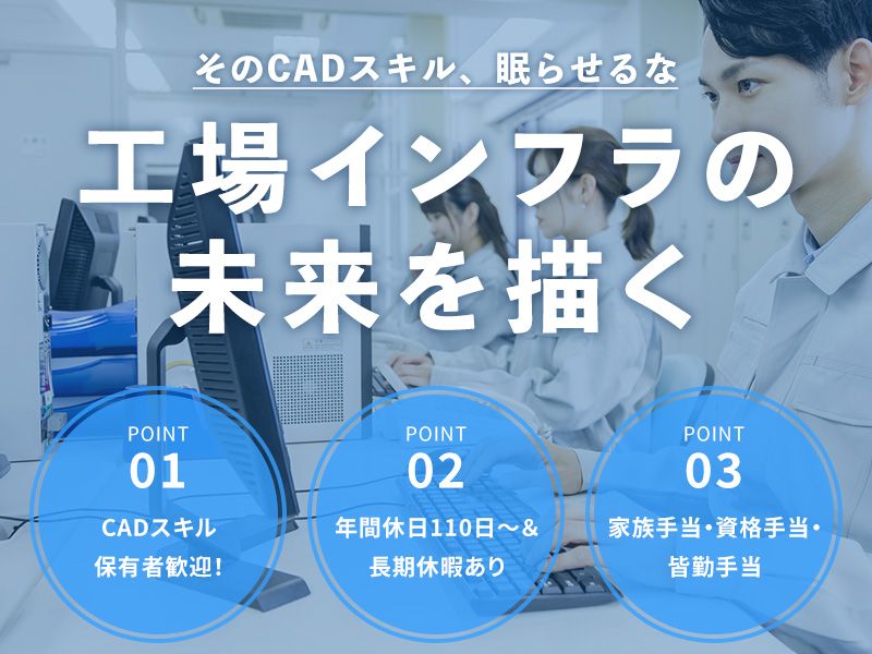 職種/仕事内容 | 仕事内容 【過去10年離職者0名】 CAD設計のスキルを活かして 安定して長く働きたい方へ!  ̄ ̄ ̄ ̄ ̄ ̄ ̄ ̄ ̄ ̄ ̄ ̄ ̄ ✅年休112日&残業月10h以内でプライベート充実! ✅賞与年2回・家族手当・皆勤手当など各種手当が充実! ✅高圧盤・動力盤など、社会インフラを支えるやりがいのある仕事です。 POINT ===== #気軽に相談しやすい職場 #出張時はオフで観光できる #各種手当充実! #残業ほぼなしで続けやすい \ 【 仕事内容 】  ̄ ̄ ̄ ̄ ̄ ̄ CADを使用し高圧盤・動力盤や制御盤の 構造・展開接続図設計を行います。 ●作成する図面 ・外形図 ・展開接続図 ・板金図 ●制御関係ではソフト設計も行います ✅出張あり …埼玉のセメント工場がメインの出張先(9割ほど) ※出張時も残業ほぼなし! 観光を楽しめる♪ ※往復交通費・宿泊費・日当の支給あり! 慣れるまで2名体制で出張現場に向かいます。 出張頻度:現場によるが、月1回程度(4月.9月.10月は月2.3回ほど) 宿泊日数:1~2泊ほど 宿泊先:現場に近いビジネスホテル(1人1部屋) *現場が近いため、通勤時間が短く 出社前・退勤後の時間がたっぷり! ご当地グルメや近くの観光スポットに出かけたり ホテルでゆったりサブスク視聴したり プライベートの時間も楽しんでいます♪ |
