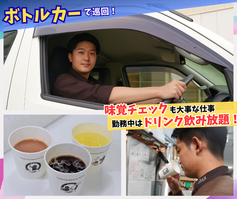 職種/仕事内容 | 仕事内容 設置の自動販売機を、トラックなどで巡回します。 ◆ルート配送場所(例) ・オフィス(社員食堂、休憩室) ・病院の待合室 ・学校 ・駅 ・空港 ・高速道路のSAなど ◆主な作業内容 ・缶・PETドリンクの補充 ・釣り銭回収、補充 ・ゴミ回収 ・機械の簡単な清掃 を行います。 平均作業時間:15~20分/台 ルート配送件数:20~30台/日 毎日決められたルートではなく、近距離の担当エリア内で自販機の稼働率などを予測し優先順位を変えたり、交通状況を加味して自分なり進めていただけます。 入社後、まずは1〜2ヶ月間先輩に同行して業務を覚えていただきますが、弊社は面倒見の良い20代、30代の社員が多く在籍していますので、研修以外でも気軽に相談しやすい環境です。人間関係はとても良いです! 【この仕事が合っている方】 ・1人が好き、1人で行動したい方 同行期間が終わったら、1人で行動しますので、自分のペースで、周りに左右されることなく仕事をしたい方に向いています。 ・体を動かすことが好きな方 補充作業を始め、車の乗り降りや移動など体力は必要とされる仕事です。 ・自分の裁量で自販機のラインナップを変更 顧客のニーズに合わせて、自販機の商品入れ替えが可能です。自分の提案で、売上が伸びたり、取引先からの感謝の言葉をもらえるとやりがいにつながります。売り上げが伸びると販売報奨金として還元されます。 【この仕事の大変なところ】 ・自販機の知識インプット 紙コップ自販機は、缶の自動販売機とは異なります。自社自販機以外に、コカコーラやサントリー(一部)の紙コップ自販機も作業範囲のため、座学的な知識のインプットが必要です。 ・突発的な故障対応による残業対応 設定した自販機の故障などの問い合わせも1日に0 ~ 4件ほど入ります。夕方頃の営業所に戻るタイミングで急に問い合わせが入り、現場に向かうケースがあります。 【入社後の研修スケジュール】 入社後は、2ヶ月かけてじっくりと業務を習得できる研修をご用意しています。 先輩社員がマンツーマンで丁寧に教えるので、未経験の方も安心してスタートできます。 1ヶ月目 座学研修:会社の事業内容や社内ルールを学びます。 OJT研修:先輩に同行して、日々の業務の流れや自販機の操作方法などを覚えます。 2ヶ月目 実務研修:独り立ちに向け、簡単な業務から少しずつ実践。 先輩のサポートを受けながら、業務をスムーズに進めるスキルを身につけます。 3ヶ月目以降 担当エリアを受け持ち、独り立ち。 定期面談やオンライン研修などで、継続的にあなたの成長をサポートします。 困ったことがあれば、いつでも気軽に相談できる雰囲気です。 私たちは、拠点全体で新入社員をサポートする体制を整えています。安心して飛び込んできてください! 12月27日(土)〜1月4日(日)は 年末年始休暇のため、 お休みをいただいております。 上記の期間の応募は もちろん可能になりますが、 お返事は1月5日(月)より 順番にご連絡させていただきます! |