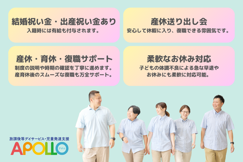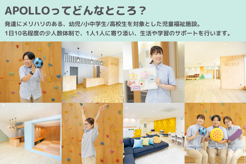 職種/仕事内容 | 仕事内容 ✨月給27万円以上 ✨17時退社も可能 ✨持ち帰り仕事&残業なし ✅仕事内容 ・お子さまの日常生活や学習の支援 ・療育プログラムの提供や記録業務 ・レクリエーション活動の企画・実施 ・普通AT車での送迎 ✅アポロってどんなところ? 発達にメリハリのある、幼児/小中学生/高校生を対象とした児童福祉施設。 1日10名程度の少人数体制で、1人1人に寄り添い、生活や学習のサポートを行います。 |