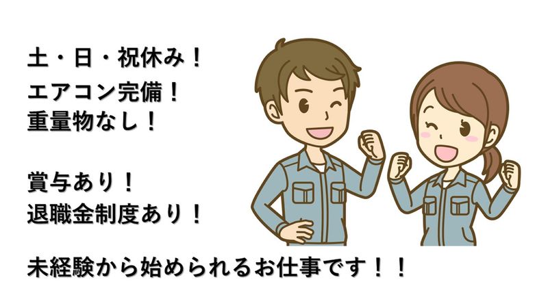 職場環境・雰囲気 | 職場環境 ・未経験の方でもすぐに覚えられるカンタン作業! ・重量物はないので女性の方も安心してお仕事できます! ・20代から50代まで幅広く、男性・女性活躍中! ・健康経営優良法人2025(中小規模法人部門)に認定されました! 喫煙所:喫煙所あり(屋外) 原則屋内禁煙 |