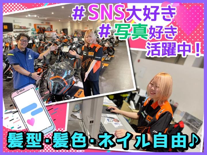 職種/仕事内容 | 仕事内容 ⭐==事務職の社員募集==⭐ \SNSに投稿と一般事務です/ ◎髪型・髪色・ピアス自由!◎ ==<バイクの知識不要>== バイクSHOPでの事務のお仕事 【具体的な内容】 ⭐先ずはご来店のお客様の対応 社員がスグにフォローします♪ ⭐パソコンを使った事務のお仕事 →基本的なPC操作ができれば大丈夫! ⭐バイクの写真撮影とSNS投稿 →普段SNSやってる人ならOK! その他、試乗会イベントの告知や イベント時のサポートもお任せします。 ワイワイ楽しくお仕事できます♪ ⭐・。良くある質問。・⭐ Q:本当にバイクの知識不要? A:はい! やることは一般的な事務の仕事 なのでバイク好きでなくても大丈夫♪ Q:必要な経験はありますか・ A:基本的なPC操作ができれば 事務未経験でも大丈夫ですが、 オフィスワークの経験が少しでもあれば その経験をいかして活躍できます! ✋購入後に保険の手続きもするので 保険事務のお仕事の経験がある方大歓迎! Q:その他、必要なことありますか? A:お客様がご来店されたときに 「いらっしゃいませ♪」 「ご予約のお客様ですか?」 など元気にご挨拶できればOKです! 販売・接客の経験もいかせられます^^ Q:髪の色が派手なんですが・・・ A:大丈夫です! 髪型・髪色・ネイルなど自由! Q:この会社で働くメリットは? A:とにかく楽しいスタッフ多数! 社内の懇親会などが多数あるので 人と人との繋がりを感じられる会社です! (自由参加) |