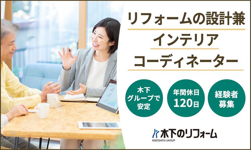 対象となる方 | 求めている人材 ◎学歴不問 【必須】 ・設計またはインテリアコーディネーターの経験 ※経験が浅い方もOK! ・一級建築士、二級建築士、インテリアコーディネーターのいずれかをお持ちの方 【以下の方はなお歓迎】 ・図面(CAD・パースなど)プレゼンボード作成経験 ・ヒアリング力・コミュニケーション力がある方 ・戸建リフォーム経験をお持ちの方 【こんな方は活躍できます】 ・協調性を持って取り組める方 ・経験・スキルを活かしながら、 自らも成長を目指したい方 ・木下グループの安定した環境で 実力を発揮したい方 |