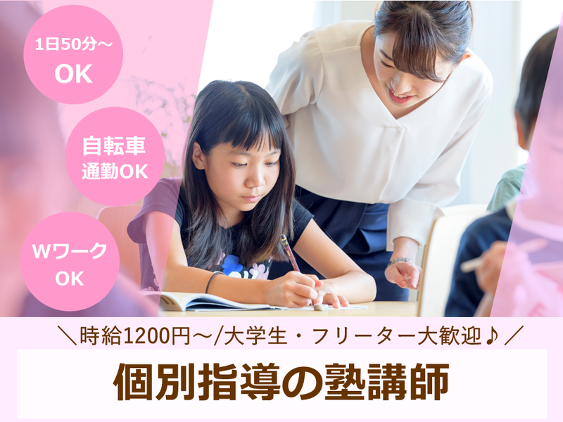 職種/仕事内容 | 仕事内容 本業が終わった後の時間や、休日の数時間を使って、あなたの知識を未来ある子どもたちのために活かしませんか? 「今の仕事だけじゃ、ちょっと物足りないな」 「空いた時間を使って、もう少し収入を増やしたい」 そんな風に考えているあなたにピッタリなのが、個別指導塾の講師のお仕事です。 生徒一人ひとりのペースに合わせ、得意科目を教えてあげてください。 ✅週1日・1コマ(50分)から勤務OK! 平日の仕事終わりや、休日の空いた時間を使って、効率的に働くことができます。 あなたのスケジュールに合わせてシフトを組めるので、本業との両立もラクラクです。 ✅授業以外の残業は一切なし! 授業の準備や報告書作成などで、サービス残業をお願いすることはありません。 もし授業以外の業務が発生した場合は、1分単位でしっかり給与をお支払いします。 ✅得意な1教科からでOK 「学生時代、数学だけは得意だった」 「英語なら少し自信がある」 そんなあなたの得意を活かせます。 指導経験がなくても、丁寧な研修があるのでご安心ください。 生徒たちの「わかった!」の笑顔が、あなたのやりがいにも繋がるはずです。 私たちと一緒に、子どもたちの成長をサポートしませんか? |
