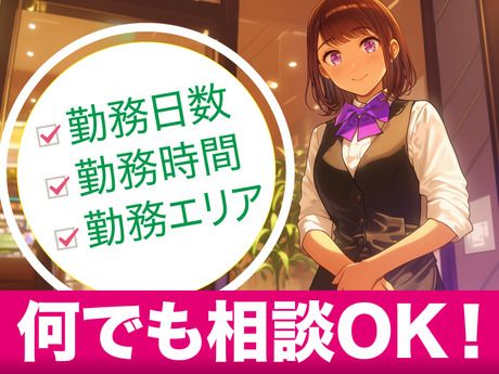 勤務時間 | シフト制 勤務時間 ・勤務時間: [1] 16:30~23:30 ・最低勤務日数(週):2日 シフトサイクル:2週間 *勤務日数は週2日~OK! *勤務時間は1日5時間~OK! ◆早番・遅番の通し勤務も可能です。ご相談下さい ◆遅番勤務の場合、終電の時間も考慮します。 *シフトは2週間ごとに希望を提出 *1ヶ月単位、3ヶ月単位、6ヶ月単位などシフトの確定期間を長くすることもできます。 *Wワークを考えている方や、毎週決まった予定や習い事がある方でも大丈夫◎ *もちろん勤務開始日もご相談ください。 急募!女性活躍中です◎土日祝休み&短時間も可能なため無理なく働けます! 早朝のスキマ時間を活用することもできますよ◎ |