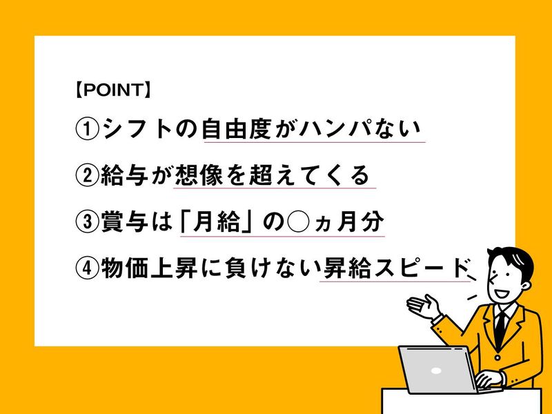 職種/仕事内容 | 仕事内容 ◆カラオケ「JOYJOY」の企画・運営/おすすめPOINT  ̄ ̄ ̄ ̄ ̄ ̄ ̄ ̄ ̄ ̄ ̄ ̄ ̄ ̄ ̄ ̄ ̄ ̄ ̄ ̄ ̄ 【1】最新の設備で、多彩な楽しみ方を提供  ̄ ̄ ̄ ̄ ̄ ̄ ̄ ̄ ̄ ̄ ̄ ̄ ̄ ̄ ̄ ̄ ̄ ̄ ̄ ̄ ̄ 最新機種を積極的に導入しており、カラオケはもちろん 迫力ある大型ビジョンでゲームやスポーツもお楽しみいただけます。 仲間同士でスポーツ観戦ができるのも JOYJOYの魅力の一つです。  ̄ ̄ ̄ ̄ ̄ ̄ ̄ ̄ ̄ ̄ ̄ ̄ ̄ ̄ ̄ ̄ ̄ ̄ ̄ ̄ ̄ 【2】裁量権を持って、成長を実感できる環境  ̄ ̄ ̄ ̄ ̄ ̄ ̄ ̄ ̄ ̄ ̄ ̄ ̄ ̄ ̄ ̄ ̄ ̄ ̄ ̄ ̄ 社員は各店舗に1名体制。 責任は大きいですが、その分裁量も大きく自由度の高い環境です。 ご自身の成長はもちろん、 アルバイト・パートスタッフの成長も実感できます。  ̄ ̄ ̄ ̄ ̄ ̄ ̄ ̄ ̄ ̄ ̄ ̄ ̄ ̄ ̄ ̄ ̄ ̄ ̄ ̄ ̄ 【3】お客様の笑顔が、私たちのやりがいに  ̄ ̄ ̄ ̄ ̄ ̄ ̄ ̄ ̄ ̄ ̄ ̄ ̄ ̄ ̄ ̄ ̄ ̄ ̄ ̄ ̄ お客様が楽しそうに来店され、好きな歌を熱唱し、笑顔で帰られる。 お帰りの際にいただく「ありがとう」の一言が、 この仕事の大きなやりがいです。 常連のお客様が多いのもJOYJOYの特徴です。  ̄ ̄ ̄ ̄ ̄ ̄ ̄ ̄ ̄ ̄ ̄ ̄ ̄ ̄ ̄ ̄ ̄ ̄ ̄ ̄ ̄ 【4】公正な評価制度で、社員の頑張りに応えます  ̄ ̄ ̄ ̄ ̄ ̄ ̄ ̄ ̄ ̄ ̄ ̄ ̄ ̄ ̄ ̄ ̄ ̄ ̄ ̄ ̄ 画一的ではない、一人ひとりに合わせた評価を行っています。 年齢や経験年数だけでなく、 日々の頑張りや成長を正当に評価し、 給与に反映させています。 誠実に仕事に取り組む人が、決して損をすることのない評価制度。 それがスタッフのモチベーションと笑顔に繋がっています。 *-*-*-* <ある社員の入社後の感想> 「求人情報にある『月給○万円~』という表記を見て、 未経験の自分は最下限からのスタートだろうと思っていましたが 私の想像を大きく超える額を提示していただき、本当に驚きました。 周りの先輩方に聞いても『自分もそうだった』と話してくれ、 社員一人ひとりをしっかり見てくれる会社なのだと実感しました」  ̄ ̄ ̄ ̄ ̄ ̄ ̄ ̄ ̄ ̄ ̄ ̄ ̄ ̄ ̄ ̄ ̄ ̄ ̄ ̄ ̄ 【5】安定した待遇で、社員の生活を支えます  ̄ ̄ ̄ ̄ ̄ ̄ ̄ ̄ ̄ ̄ ̄ ̄ ̄ ̄ ̄ ̄ ̄ ̄ ̄ ̄ ̄ □20年以上毎年賞与を支給! □昇給年1回・賞与年2回! この20年間、いかなる状況下でも賞与の支給が途絶えたことはありません。 社員への利益還元を第一に考える、当社の揺るがぬ姿勢です。 また昨今の物価上昇にも配慮し、全社員一律のベースアップも着実に実現しています。  ̄ ̄ ̄ ̄ ̄ ̄ ̄ ̄ ̄ ̄ ̄ ̄ ̄ ̄ ̄ ̄ ̄ ̄ ̄ ̄ ̄ 【6】「心から」社員を大切にする社長がいます  ̄ ̄ ̄ ̄ ̄ ̄ ̄ ̄ ̄ ̄ ̄ ̄ ̄ ̄ ̄ ̄ ̄ ̄ ̄ ̄ ̄ 当社の何よりの誇り。 それは社員を心から大切にする社長の存在です。 コロナ禍で、多くの飲食店が休業を余儀なくされました。 私たちも例外ではなく、社員もアルバイトも、 誰もが先の見えない不安を抱えていました。 しかしその時、社長から伝えられたのは 「一人も解雇しない。社員はもちろん、アルバイト・パートも会社が責任をもって守る」 という固い決意でした。 その言葉がどれほどスタッフ達の心を和ませ、勇気づけてくれたことか。 事実、休業期間中も全員に給与が支払われました。 このような社長の下で働けることを、社員一同誇りに思っています。 社長の人望が厚いのも、決して偶然ではありません。  ̄ ̄ ̄ ̄ ̄ ̄ ̄ ̄ ̄ ̄ ̄ ̄ ̄ ̄ ̄ ̄ ̄ ̄ ̄ ̄ ̄ ◆コロナ禍後も積極出店中!1店舗も閉店なし ◆コロナ禍後も、積極的に設備強化や改装を実施しています ◆昨今の物価高にもいち早く対応し、給与のベースアップも実施! 【具体的な仕事内容】 ・接客、アルバイトの育成 ・シフト作成 ・経費管理 ・イベント考案 ・仕入れ など |
