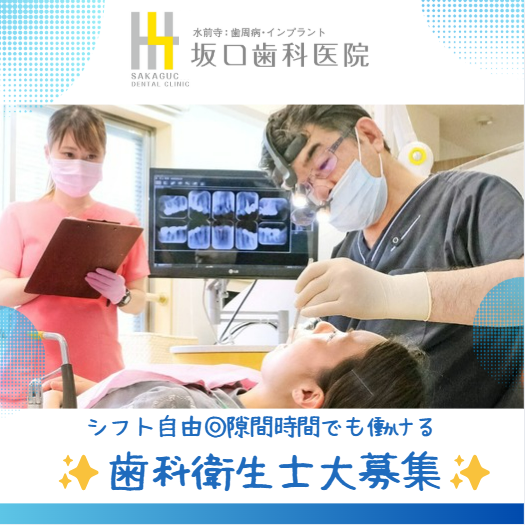 職種/仕事内容 | 仕事内容 \✨シフトはあなた次第✨/ 勤務日数、時間は自由 ◆子育て主婦さん多数活躍中◆ 家庭との両立を全力応援 *‥‥*【 アピールポイント 】*‥‥* ✅週1日~OK! →「ちょっとだけ働きたい」も大歓迎♪ ✅シフトは自由! →家庭の予定に合わせて調整できます◎ →隙間時間でもOK◎ →午前だけ・午後だけも相談OK! ✅扶養内・WワークもOK! ✅子育て主婦さんが多数在籍! →急なお休みにも理解ある職場♪ ✅安心の高待遇◎ →時給1,300~1,800円 ✅正社員登用あり ✅ここにしかないキャリアUPも →認定歯科衛生士を最短5年で目指せる環境! ✅好立地★交通の便◎ →新水前寺駅の目の前♪ ✅経験不問 →資格お持ちで衛生士の経験がない方もOK ✅AIG保険 ※疾病・怪我等の自己負担を補償 ✅ハイパーメディカル従業員補償あり ※勤務外の事故や病気でも保険適用。 差額ベッド代1万円など *‥‥*‥‥*‥‥*‥‥*‥‥*‥‥* ⭐お仕事内容!  ̄V ̄ ̄ ̄ ̄ ̄ ̄ ̄ ̄ ̄ ̄ ̄ 歯科衛生士業務全般をお願いします! 〇歯科診療補助 〇歯科予防処置 〇歯科保健指導 など 一人ひとりに合わせて丁寧にサポートします ので、安心してスタートできます♪ ✨正社員の道も✨ 「もっと稼ぎたい」 「しっかり働きたい」 という方は、正社員になる道もご準備! 積極的に社員登用しているので遠慮なく ご相談ください◎ ✨ここにしかないキャリアUP✨ 認定歯科衛生士の資格取得をサポート 当院は、 日本歯周病学会認定歯周病専門医、 日本口腔インプラント学会認定インプラ ント専門医であるため、 通常取得に15年程かかるところ最短5年 で取得可能! 過去に30人の取得を支援♪ 取得に必要な学会参加の費用補助あり ⭐当院について!  ̄V ̄ ̄ ̄ ̄ ̄ ̄ ̄ ̄ ̄ ̄ ̄ 当院は、2008年5月7日に開院し、 特に力を入れているものは、 歯周病とインプラント治療です♪ 地域医療に貢献できる歯科医院を目指し、 最新の治療技術を導入して、患者様との コミュニケーションを大事にしています! お子様からご高齢の方まで幅広い患者様 の笑顔を創るる医院づくりを進めて います♪ ⭐SNS・HPもご覧ください!  ̄V ̄ ̄ ̄ ̄ ̄ ̄ ̄ ̄ ̄ ̄ ̄ 「職場の雰囲気を知りたい」 「どんな人達が働いてるか知りたい…」 そんな不安な気持ちがある方はぜひ当院のHPやインスタを検索してみてください! 楽しい雰囲気や魅力がきっと伝わると思います♪ ✅Instagram ID:@sakaguchidental ✅HP:https://www.sakaguchi-shika.com/ |