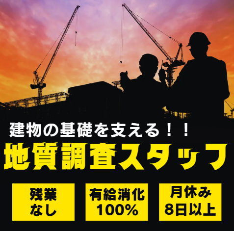 職種/仕事内容 | 仕事内容 ▼おすすめPOINT▼ ✅残業なし!(作業が終わり次第退勤OK) ✅休暇制度の充実(有給消化率100%) ✅月8日以上の休み ✅ワークライフバランス◎ ▼少しでも気になった方は下記をCheck▼ 突然ですが、今の職場でこんな悩み抱えていないですか?? 「現場の作業が終わっても、事務作業に追われる」 「残業が多くて、職場と家の往復の日々」 「休みが満足に取れず、プライベートが疎かになってしまっている」 この悩み、すべて当社で解決します!! はじめまして。代表の加藤です。 当社では、あなたの大切なプライベートの時間を守るお約束をします! 私自身、仕事ももちろん好きですが、 趣味や遊び、家族との時間はもっと好きです!! 当社では働くモチベーションとして、プライベートの充実は欠かせないという考えを持っており、 従業員の趣味などは全力で応援します。 例えば、「推し活」が趣味の社員が 「どうしても行きたいライブがある」と相談してきた際には 「大切なライブなんだろ!絶対行ってこい!」とお休みをあげます。 子どもの学校行事はもちろんみんな皆勤賞です! よく遊び、よく働く。そんな会社の一員になりませんか? ◆お仕事内容◆  ̄ ̄V ̄ ̄ ̄ ̄ ̄ 地質調査のお仕事! 主に、機械ボーリング作業の補助業務をお任せします。 1メートルずつ深さをずらしながら、土壌を採取する作業です! 土壌の安全性を確認するために不可欠な役割を担っています。 ◆残業なしの秘訣◆  ̄ ̄V ̄ ̄ ̄ ̄ ̄ ̄ 現場系のお仕事は「残業が多い」というイメージを持つ方も多いと思います。 なぜ当社が「残業なし」を徹底できているかというと、 事務作業を現場スタッフには一切やらせないからです。 事務作業がないからこそ、現場の作業に集中ができ、 作業の質も向上すると考えております。 また、最近では社員の声をもとに、 現場が早く終われば定時を待たずに帰れる制度も導入しました! ◆出張もあるお仕事です◆  ̄ ̄V ̄ ̄ ̄ ̄ ̄ ̄ ̄ ̄ ̄ ̄ 案件によっては県外への出張もあります。 もちろん、別途出張費を支給◎ 出張先で仕事以外の時間の使い方は自由です。 ご当地グルメや観光を楽しむもよし。 たまには家族と離れて一人でゆっくり休むもよし。 「羽を伸ばせる」のが出張の楽しみだったりします!(笑) 出張できる方も歓迎です! |