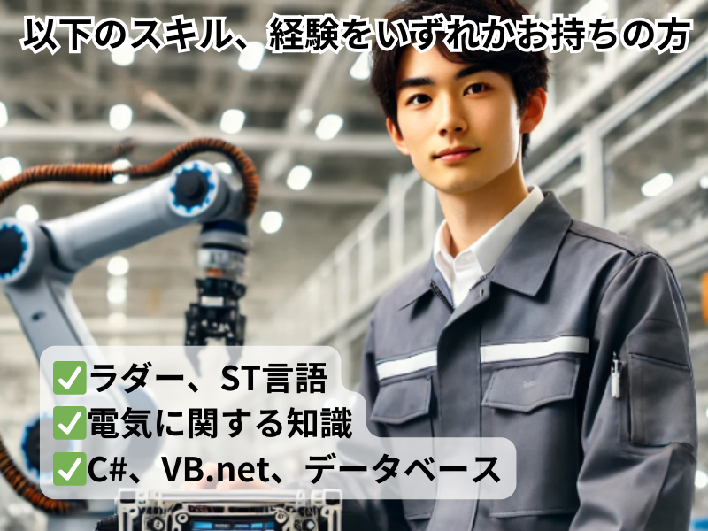 対象となる方 | 求めている人材 ■お人柄重視の採用です ■普通自動車免許 ■高校卒業以上 ■以下のスキル・経験をお持ちの方(いずれかでOK) ・ラダー、ST言語 ・電気に関する知識、電気工事、制御盤設計、CAD ・C#、VB.net、データベース |