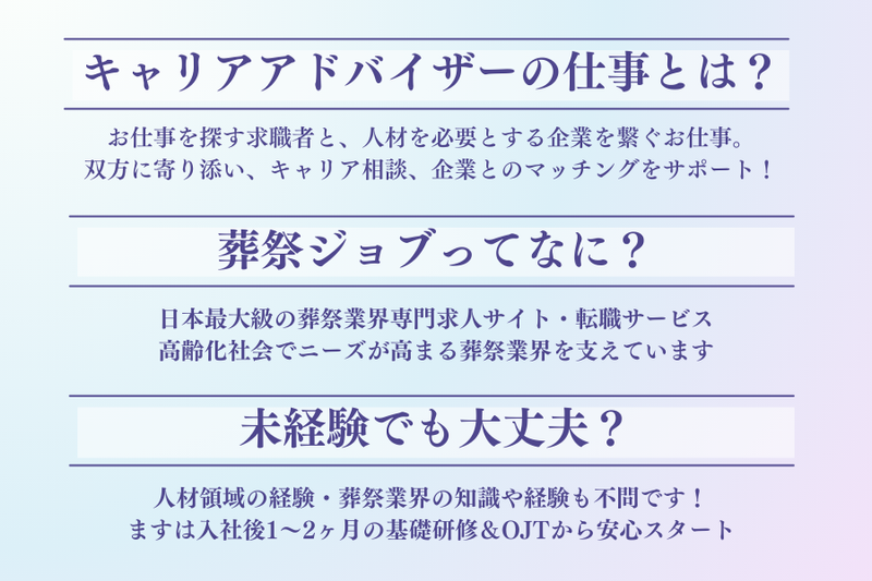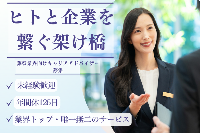 職種/仕事内容 | 仕事内容 ─┘─┘─┘─┘─┘─┘─┘─┘─┘ ▼働きやすい理由&魅力▼ ✅年間休日125日 土日祝休みでプライベートも充実✨ ✅残業月平均20時間以下、18時台退社が中心 ✅月曜は全員リモートワーク ✅1時間単位で有給休暇取得OK!柔軟な働き方をサポート ✅報奨金年4回・賞与年2回、成果に応じた公平な評価制度あり ─┘─┘─┘─┘─┘─┘─┘─┘─┘ 葬儀業界で仕事を探す人と、人材を探す企業をマッチングするお仕事です。具体的には、転職サイト「葬祭ジョブ」の登録者に対する転職支援、全国400社ほどの取引企業に対する求人情報の収集がメインです。採用の専門性、交渉力、カウンセリング力、分析力など、様々なスキルを高めることが可能で、人としても大きく成長できるお仕事です。 ▼業務内容 ・求職者へのヒアリング、求人のリサーチ、企業への人材提案 ・求職者への選考対策サポート(応募書類添削、模擬面接など) ・採用面接への同行、入社条件の交渉、入社後のフォローアップ ▼働き方 ・担当する求職者との面談は、オンラインや電話が多いです。 ・担当する求職者のお住まいが首都圏の場合、直接お会いして面談することもあります。 ・担当する求職者の採用面接場所が首都圏の場合、求職者に同行することもあります。 ▼入社後の活躍イメージ ・先輩社員と企業の打合せに同席して、求める人物像の把握、求人原稿作成を行います。 ・先輩社員と求職者の面談に同席して、キャリア支援について学びを深めていきます。 ・入社半年後には一人前の転職エージェントとして、成果が出せるようにサポートします。 ▼働き方のメリット ・外出時は直行および直帰ができます。 ・1時間単位で有給休暇の取得ができます。 ・体調不調、育児や介護などご事情に合わせてリモートワークが可能です。 ・月曜日は全社員がリモートワークになります。 ・19時以降に電話面談があれば終業時刻前(17時など)に帰宅できます。 ・残業は少なく18時台に退社することが多いです。 ▼1日のスケジュール例 9:00 出社してオフィスワーク(メール対応、履歴書添削) 10:20 外出(担当する求職者の採用面接に同行) 12:30 帰社 同僚とランチ休憩(ベトナム料理) 14:00 求人企業とのオンラインMTG(最新求人のヒアリング) 15:00 求職者とオンライン面談(面接対策) 16:00 求人原稿の作成、企業への人材提案 17:00 チーム内のMTG(現状報告、人材の共有など) 18:00 退社 |