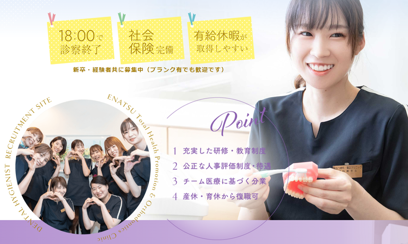 職種/仕事内容 | 仕事内容 .˚♢⁺‧┈┈┈┈┈┈┈┈┈┈┈┈┈‧⁺ ♢˚. 鹿児島市内にある 自由診療型の総合歯科医院 『えなつ歯科・矯正クリニック』 歯科衛生士さんの成長意欲と ライフワークバランスを 大切にする歯科医院です✨ .˚♢⁺‧┈┈┈┈┈┈┈┈┈┈┈┈┈‧⁺ ♢˚. 『えなつ歯科・矯正クリニック』では 欠損歯に対する理想的な選択肢として 各種インプラント治療や精密義歯である プレミアムデンチャー、 天然歯の治療については メタルフリーを推奨し、 より美しく健康になれる 審美歯科治療を主に提供しています。 また、成人矯正・小児矯正共に 専門性を高く保ちながら、 歯並びだけでなく咬み合せなどの トータルバランスを含めた 歯並び治療を実施しています。 これらの高度な治療法の精度を高め、 予後をより良い状態に導いて いただいているのが、 当院の歯科衛生士さんです! .˚♢⁺‧┈┈┈┈┈┈┈┈┈┈┈┈┈‧⁺ ♢˚. 当院における歯科衛生士さんの特徴 .˚♢⁺‧┈┈┈┈┈┈┈┈┈┈┈┈┈‧⁺ ♢˚. ╭━━━━━━━━━━━╮ 初期歯周治療とSPT等の メンテナンスに力を 入れています! ╰━━━━━v━━━━━╯ 当院の歯科医師は、 自由診療を手掛けることも多く、 その分、患者さんの口腔ケアを 大切にしています。 ╭━━━━━━━━━━━╮ 職種ごとでの医療チーム として連携を大切に しています! ╰━━━━━v━━━━━╯ 歯科衛生士さんには、 メンテナンス及び歯周病治療の 業務を行っていただきます。 歯科助手件コーディネータが 在籍してるので診療補助は ほとんどありません。 歯科衛生士さんにしかできない お仕事を中心に行っていただく分、 カウンセリングや滅菌・消毒を しっかり行うスタッフさんとの 連携も大切にしています。 ╭━━━━━━━━━━━╮ 成長したい気持ちを 後押しする制度が 沢山あります! ╰━━━━━v━━━━━╯ 歯科衛生士のお仕事も、 どんどん出来ることが 増えてきています。 活躍できる幅が広がり、 自分次第でどんどん成長できる 職種になっています。 「色んなことを学びたい!」 「一つのことをもっと 深く学びたい!」 そんなあなたの成長意欲を 高めるサポート制度が 充実しています。 ╭━━━━━━━━━━━╮ スタッフがお互いに 支え合うことで長く働ける 職場になっています! ╰━━━━━v━━━━━╯ 育児中の方、習い事もしている方、 それぞれのライフスタイルで 仕事もプライベートも充実して いただくためには、 職場のみんなが 協力し合うことが大切です。 それぞれの「こうしたい!」 という気持ちを叶えるために、 スタッフ同士が サポートできる環境は、 みんなにとって有難いものです。 ╭━━━━━━━━━━━╮ ご自身の経験やスキル、 やりたいお仕事などの 特性に合わせて お仕事をお任せします! ╰━━━━━v━━━━━╯ ひと口に歯科衛生士さんといっても、 予防をしたい方、アシスト中心の 働き方に興味がある方、 矯正を中心に行いたい方など、 様々な想いがあると思います。 まずは、あなたのやりたいこと、 なりたい衛生士像を教えてください。 私たちがご提供できるお仕事を、 納得いくまでご説明させて いただきます。 .˚♢⁺‧┈┈┈┈┈┈┈┈┈┈┈┈┈‧⁺ ♢˚. 当院では、歯科衛生士さんが行う 歯周病の治療や 予防メンテナンスについても、 北欧式の予防歯科医療の考え方、 精密な検査・診断データを 定期的に管理しながら 根拠のある予防歯科医療を提供する メディカルトリートメントモデルを 採用しながら、 予防歯科処置を実施しています。 .˚♢⁺‧┈┈┈┈┈┈┈┈┈┈┈┈┈‧⁺ ♢˚. |