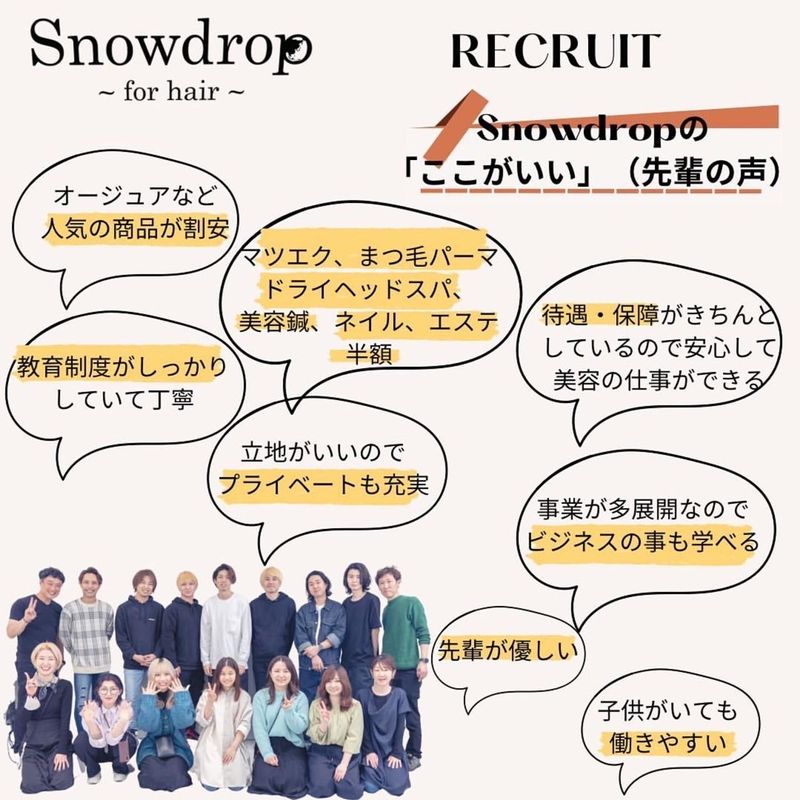 待遇・福利厚生 | 【保険制度】 雇用保険、労災保険 【福利厚生】 待遇・福利厚生 【福利厚生】 ・店販手当 ・交通費支給(¥20000まで) ・社内マーケターによるSNSサポート ・動画による教育カリキュラム ・多角事業の経営、商品開発、展開が学べる ―嬉しい社割あり!― ・自社サロン(Snowdrop) カット・カラー・パーマ半額 ・自社サロン(カリーナ シルス荻窪) マツエク・まつ毛パーマ半額 ・自社サロン(ひつじの安らぎ) ドライヘッドスパ・美容鍼半額 ・自社サロン(シルス荻窪) ネイル半額 ・自社サロン(カリーナ荻窪) エステ半額 ・オージュア・ケラスターゼ・インプレア・MTG・SDオーガニックシリーズサロン専売品のスタッフ割引有り 【オーナーより】 はじめまして、オーナーの柴田です! 私は高校を中退して地元の美容室で3年程勤務した後ロンドンへ2年間留学。留学から戻り美容室Snowdropを立ち上げました。 私は、サロンの空気を作るのはオーナーや店長だと思っています。 トップの機嫌が良ければ、サロンの雰囲気もよくなりスタッフが働きやすい環境を作ることができる。 さらに、お客様と日々接しているスタッフの方が良いアイデアを提案してくれるのでいつも私がわからない考え方・価値観を教えてもらっています。 「世の中の女性の美容と生活の向上に貢献する」このコンセプトを共通の志として一緒に素敵なサロンを作っていきましょう! |