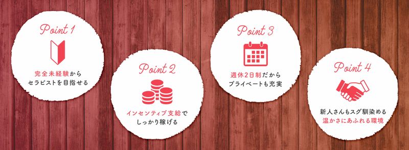 職種/仕事内容 | 仕事内容 <採用残りわずか!> \未経験&無資格でも大歓迎!/ 【 当社の魅力 】 01|未経験でも安心の手厚い研修あり 02|シフト勤務だからお休み調整しやすい 03|決算賞与あり 04|残業なし&定時退社可能 【 仕事内容はコチラ 】 ボディケア・トリートメントの施術を中心とした サロン業務全般をお願いします。 *もみほぐし *タイ古式マッサージ *バリニーズリンパトリートメント *ヘッドスパ など ≪もっと詳しく働き方をご紹介≫ 1日に対応するお客様は4名程度。 コースにもよりますが、施術時間は60~120分です。 お客様がいないときはSNSの更新をお願いします。 無理なく働けるような環境を整えているので、 リラクゼーションセラピストとして、 お客様の健康や美容を管理していきましょう! ≪まずは丁寧な研修でサポート≫ 現在活躍中の先輩たちも、全員が未経験スタートです。 入社から3週間は基礎知識や技術をしっかり身につける期間。 先輩スタッフのOJTであなたの成長をサポートします。 |
