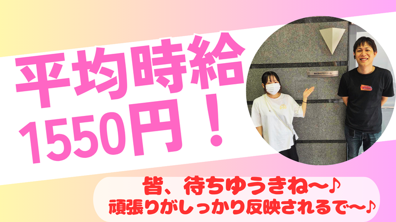 勤務時間 | シフト制 勤務時間詳細 ⏰9:00~18:00 ⭐週3日~OK! ⭐1日4時間~OK! ⌚休憩スタイル選べます!  ̄ ̄ ̄ ̄ ̄ ̄ ̄ ̄ ̄ ̄ ̄ ̄ ̄ ̄ 「集中して短時間で働きたい」も 「しっかり休憩をとりながら 長めに働きたい」もどちらもOK! 以下のように、勤務スタイルに 応じて休憩の取り方を選べます。 ▼お昼休憩なし(計70分/7時間50分勤務)  ̄ ̄ ̄ ̄ ̄ ̄ ̄ ̄ ̄ ̄ ̄ ̄ ̄ ̄ ̄ ̄ ̄ ̄ ̄ 10:20~10:30 12:00~12:10 13:00~13:10 14:00~14:10 15:00~15:10 16:00~16:10 17:00~17:10 ▼お昼休憩あり(計120分/7時間10分勤務)  ̄ ̄ ̄ ̄ ̄ ̄ ̄ ̄ ̄ ̄ ̄ ̄ ̄ ̄ ̄ ̄ ̄ ̄ ̄ 10:20~10:30 12:00~13:00(昼休憩) 13:00~13:10 14:00~14:10 15:00~15:10 16:00~16:10 17:00~17:10 どちらも選択可能なので、 自分の集中力や働き方に合わせて 調整できます! 「短時間で効率よく」 「ゆとりを持って1日しっかり」 …あなたらしい働き方を応援します♪ |