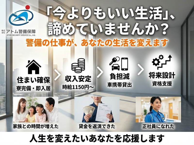 対象となる方 | 求める人材: 未経験者歓迎 ブランクOK 無資格OK 経験者歓迎 大学生歓迎 フリーター歓迎 18~20代・30代・40代・50代活躍中 ミドル・中高年活躍中 定年後働く60代の方・シニア活躍中 男性・女性活躍中 掛け持ちバイト・副業OK・WワークOK ハローワークで求職中の方も大歓迎 《活かせる経験》 施設警備・常駐警備・巡回警備 夜間警備・警備員・駐車場管理・交通誘導・清掃など |