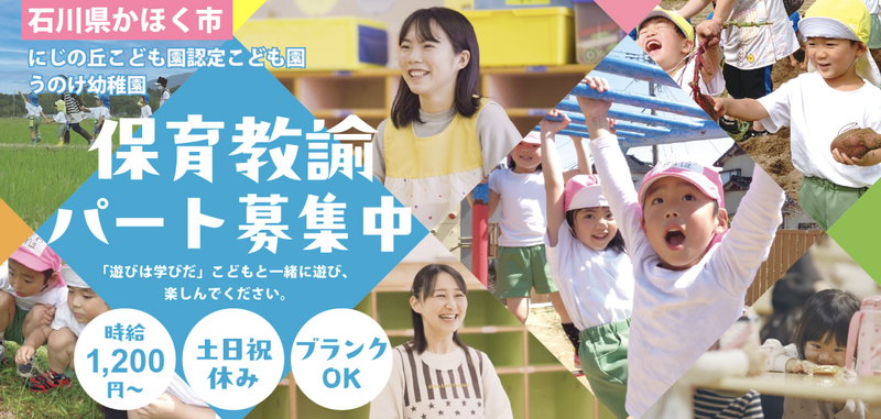 職種/仕事内容 | 仕事内容 当園の1~5歳児のクラスの担任/副担任をお願いします。 かほく市にある認定こども園うのけ幼稚園の魅力は、自然に触れた体験型の学びと、季節ごとの行事やイベントを本気で楽しむこと。 園長自ら率先し、子どもたちの「体験」のために奔走しています。 子どもたちの笑顔がいっぱいに溢れると、先生の笑顔も増える。 ひとりで働くのではなく「スタッフ/チーム一体型」のマネジメントがあるからこそ、クラスもまとまり「もっともっと子どもたちのために」と方向性が明確に。 勉強や学びは退屈じゃない。 遊びと体験の中からこそ、園児と一緒に先生が成長したり、幸せを感じる瞬間があるんです。 ー 【1日の流れ】 8:30〜 朝は、まずクラスの出欠確認を行い、保護者の方とコミュニケーションをとります。 その後、子どもたちの着替えを手伝い、連絡帳の回収などを行います。 10:00〜 午前中は、活動の段取りを整え、クラスの運営を進めます。 子どもたちと一緒に遊びます。 11:30〜 お昼には、子どもたちと一緒に食事を楽しみながら、食事の補助を行います。 食事が終わった後は、片付けや掃除をします。 13:00〜 午後は、園庭やお遊戯室で子どもたちと遊ぶ時間です。 体を使った遊びを通じて、子どもたちの成長をサポートします。 14:00〜 帰りの準備をサポートします。 子どもたちがスムーズに帰れるようにお手伝いをします。 14:30〜 保護者の方が迎えに来られたら、その日の様子についてお話ししてコミュニケーションを取ります。 15:00 保育終了 16:00〜18:30 明日の保育や行事の準備をします。 ・園バスは専属の先生がいます ・曜日に合わせて体操教室やプログラミング教室等の課外活動有り ・基本は8:30-17:00ですが、月に何回か早番や遅番があります ー 【宇ノ気学園ってこんなところ】 ◆見て触れて、体感する。本気の遊びは最高の学び。 四季を通して、たくさんの行事があるのが特徴です。 田植えや稲刈りなど食に関わるもの。 かるた大会やお茶会といった伝統・文化に関わるもの。 剣道やトライランド(体操)のように運動のもの。 老人ホームへの訪問や消防パレードといった地域の方に触れ合える機会。 たくさんの行事と遊びから、ひとつでも多くの発見があるように。 一体感のあるイベントを通して、楽しい体感から学びをつくっています。 ◆普段から、話しやすい。最高のコミュニケーション。 宇ノ気学園には、子どもたちのためのコミュニケーションが溢れています。 保育士同士、職員みなフラットで話しやすい職場環境があるからこそ、フランクなコミュニケーションで日々の業務をスムーズに行えます。 そして、園長自らがとても動きます。 園長室の扉は常に開かれていて、相談したり話しやすい環境がそこにあります。 上下関係なく対話することで、最高のチームを創りたいと考えています。 ◆同じ目的、目標。子どもたちのために動ける強み。 表現会(11月)と運動会(9月)は、子どもたちの成長を感じられる2大行事。 先生たちも当日までは大変ですが、同じ目的と目標があるからこそ、子どもたちの笑顔を想って一緒にワクワクします。 元気で明るく体育会系の雰囲気もあり、肩肘を張らず自然体で働けるのが魅力です。 趣味の音楽やライブなどが大好きな20〜30代スタッフも多数。 地元養成校の卒業生も多く勤務しています。 ー 【スタッフインタビュー】 2021年入社|保育教諭 ◆爽やかな会話と 人間関係が魅力。 私は、現在金沢市在住ですが、母園でもあるうのけ幼稚園の明るくチームワークを感じる保育に惹かれ入社を決めました。 園の魅力は、どの先生の言葉もはっきりと明快でわかりやすいこと。 「ここは良かった」「この部分は次直していこう!」と前向きにフィードバックしてもらえることが、私に合いました。 他に、私がこの園ならではと感じるのは、苦手をカバーし合う文化。 ピアノや絵を描くことが苦手だったのですが、ピアノの得意な先生が苦手な私でも弾きやすい楽譜を教えてくれたり、絵の得意な先生にイラストをコピーさせてもらったりとたくさん 助けてもらい1年目を乗り越えられました。私は元 バスケ部で体力に自信があるので、たくさん体を動かすことで貢献しています。 4年目の今、子どもたちの個性に合わせて、寄り添う保育が目標。 「子どもたちの笑顔のために」周りの先生と同じ志をもって挑んでいきたいです。 ー 【かほく市について】 かほく市は、金沢から車で約20分の距離に位置する、自然と文化が豊かなエリアです のどかな田園風景と近代的な生活設備が調和し、ショッピング施設や医療機関も充実しています。 さらに、かほく市では、暮らしをサポートするさまざまな支援制度が充実しています! ◆出産・子育ての給付金(補助金・助成金) 出産祝い こども医療費助成 マタニティタクシー支援 ファミリーサポートセンター利用(無料)券交付 不妊・不育症治療費助成 チャイルドシート購入補助金 保育サービス